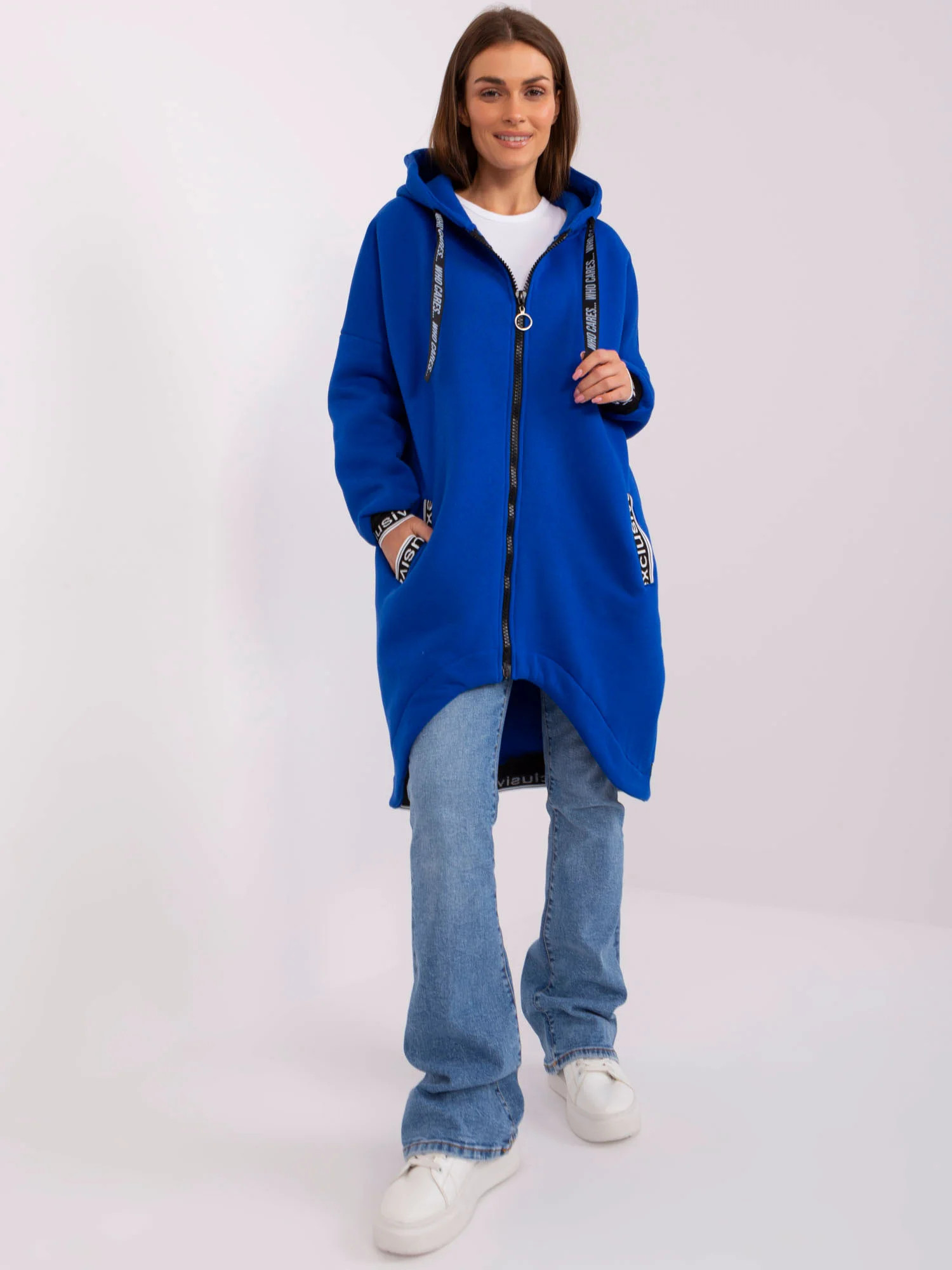Wymiary bluzy w rozmiarze S/M mierzone na płasko: szerokość pod pachami - 70 cm, długość całkowita - 103 cm, długość rękawa - 63 cm.