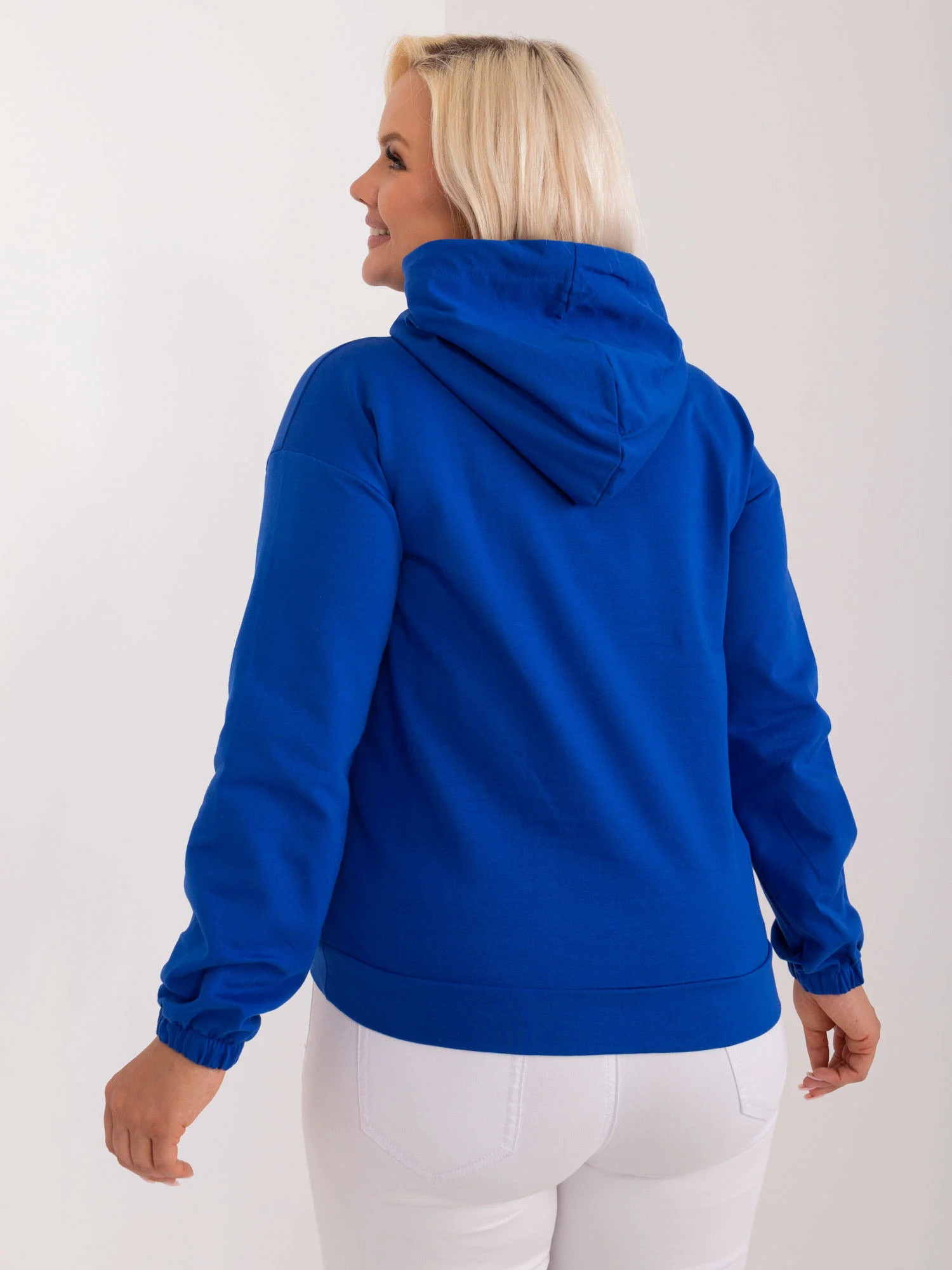 Wymiary bluzy w rozmiarze one size mierzone na płasko: szerokość pod pachami - 55 cm, długość rękawa - 61 cm, długość całkowita - 61 cm.