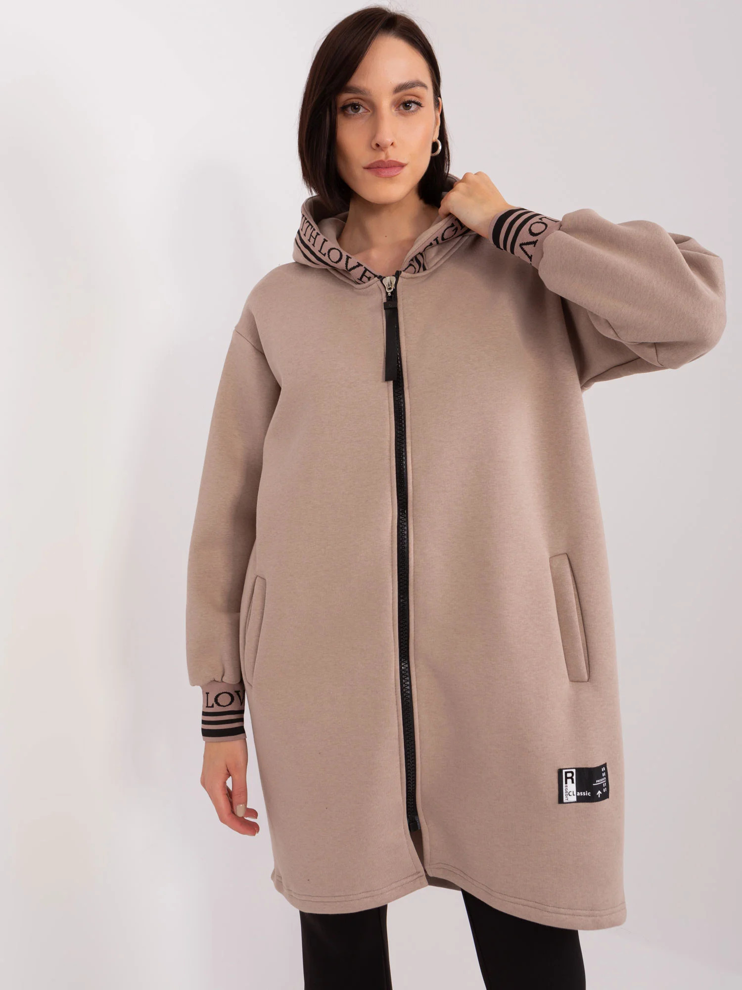 Ciemnobeżowa długa bluza rozpinana.