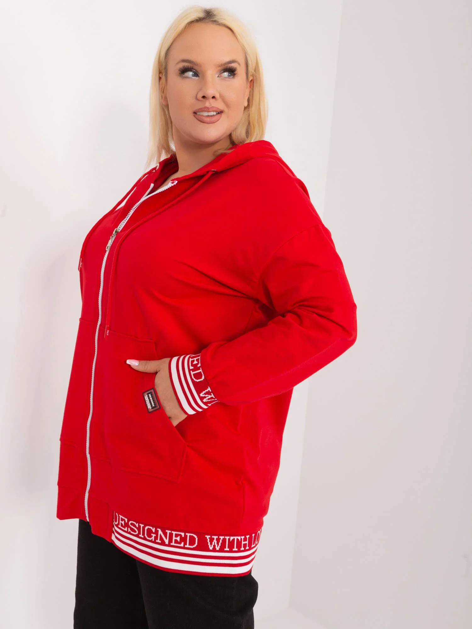 Wymiary bluzy w rozmiarze one size mierzone na płasko: szerokość pod pachami - 65 cm, długość rękawa - 56 cm, długość całkowita - 77 cm.
