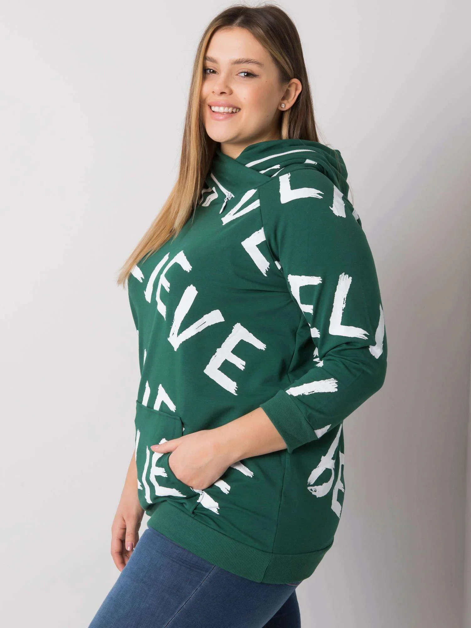 Wymiary bluzy w rozmiarze one size mierzone na płasko: szerokość pod pachami - 62 cm, długość całkowita - 72 cm, długość rękawa - 44 cm.