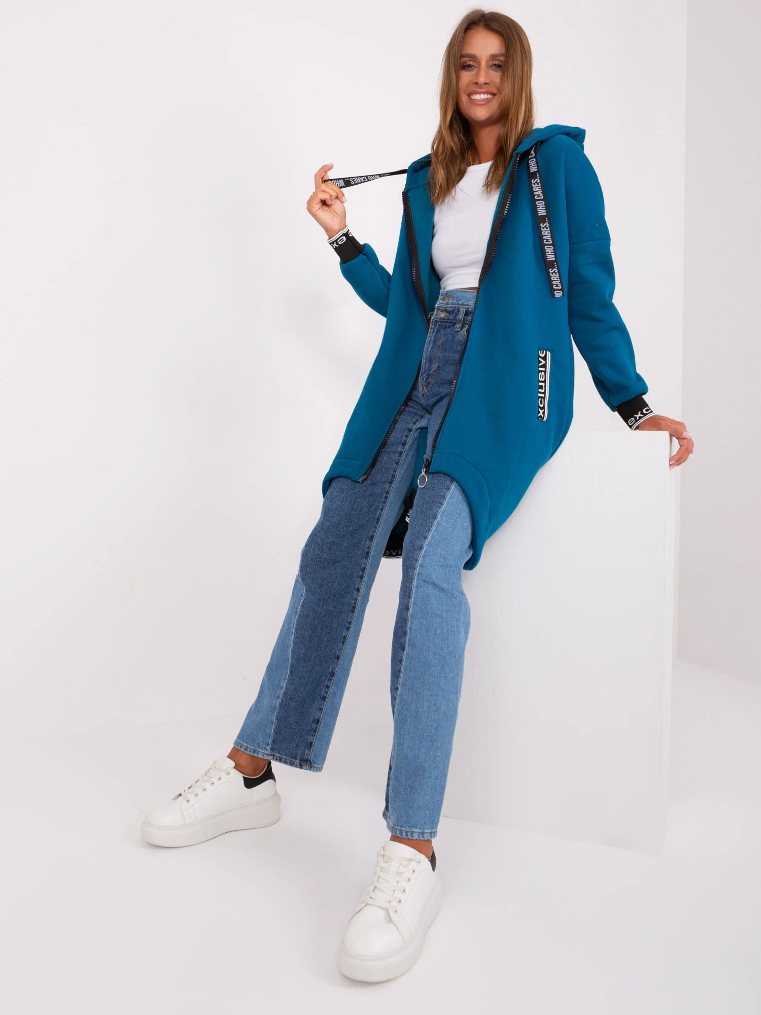 Wymiary bluzy w rozmiarze S/M mierzone na płasko: szerokość pod pachami - 70 cm, długość całkowita - 103 cm, długość rękawa - 63 cm.