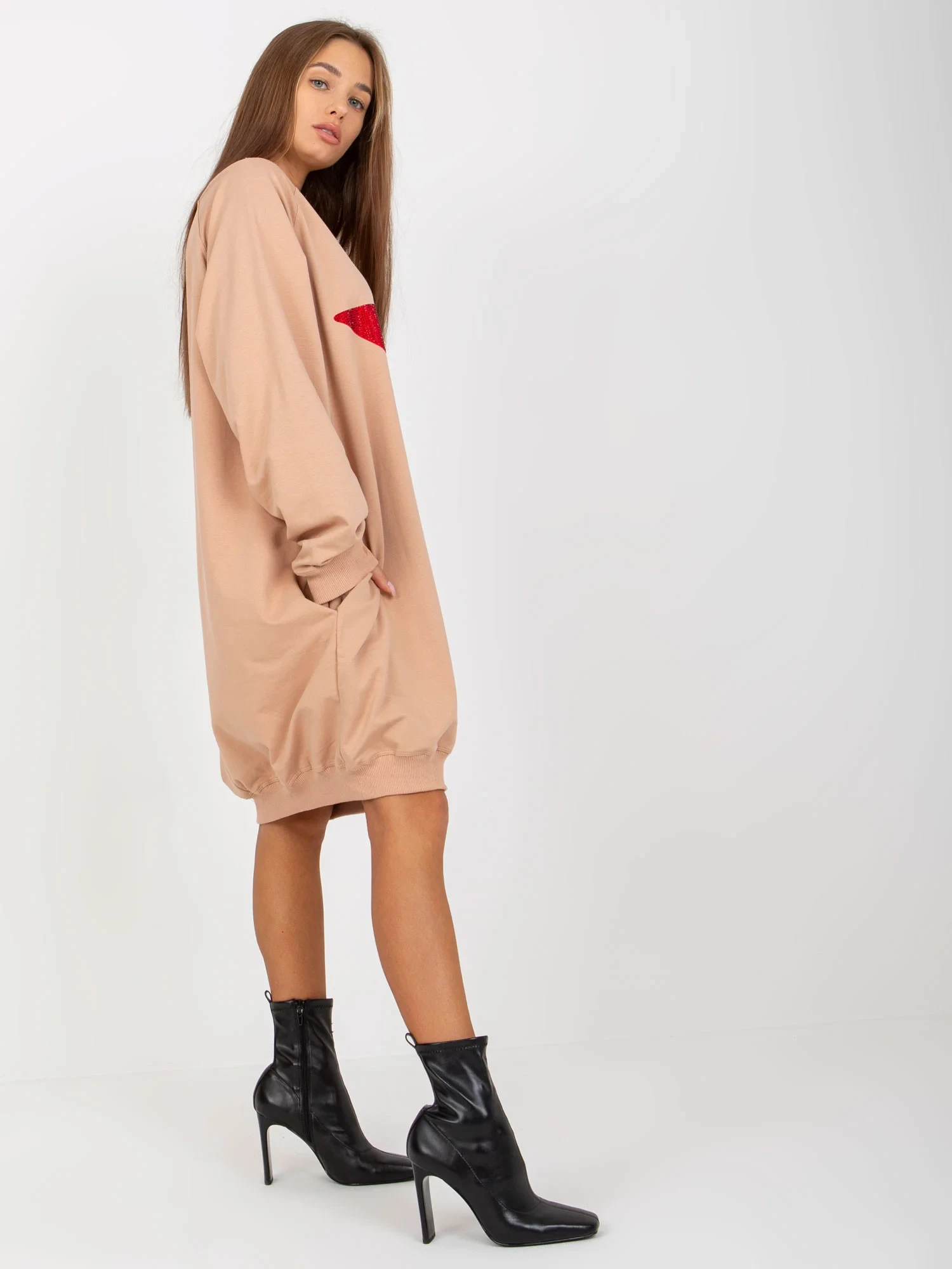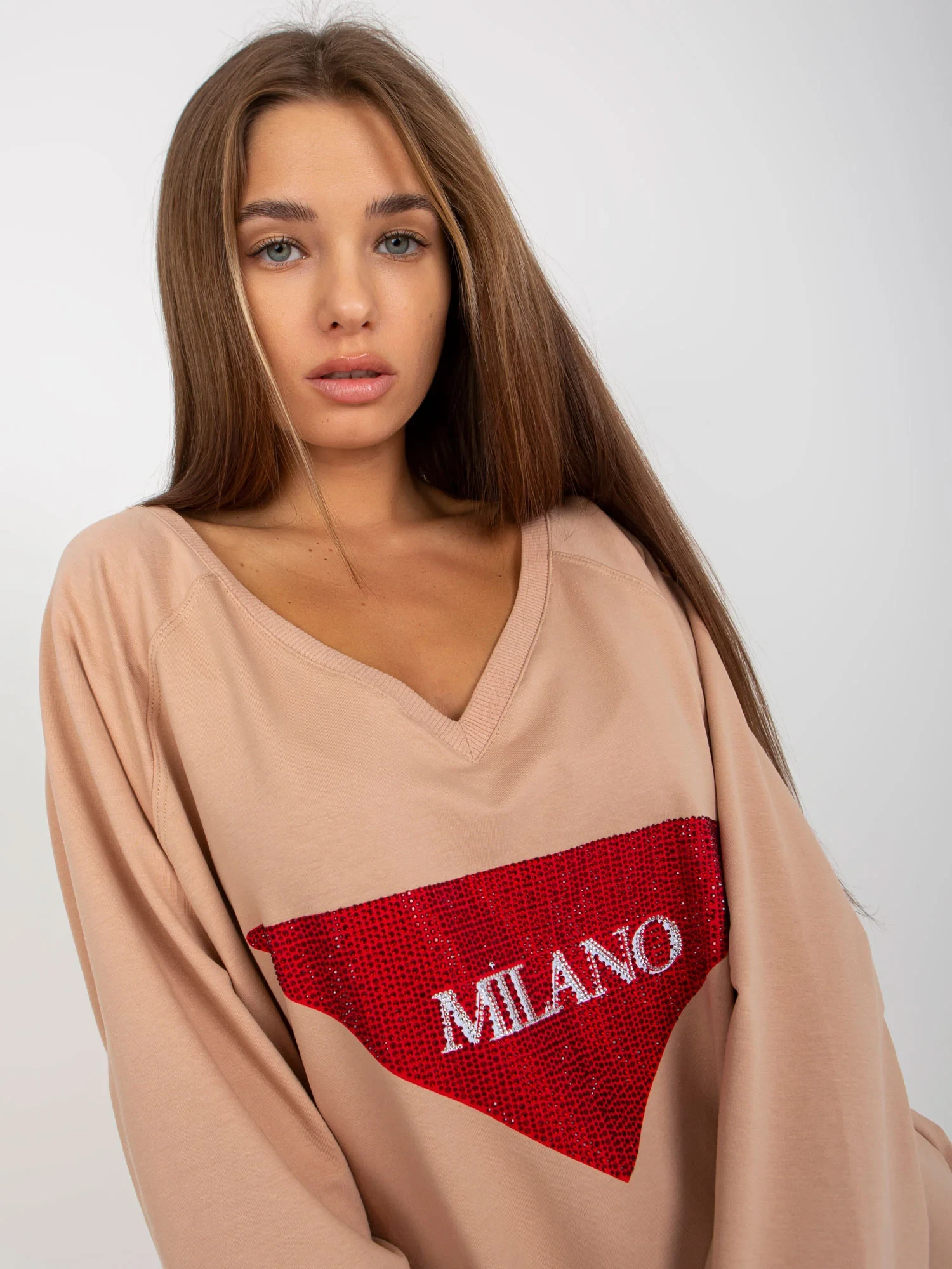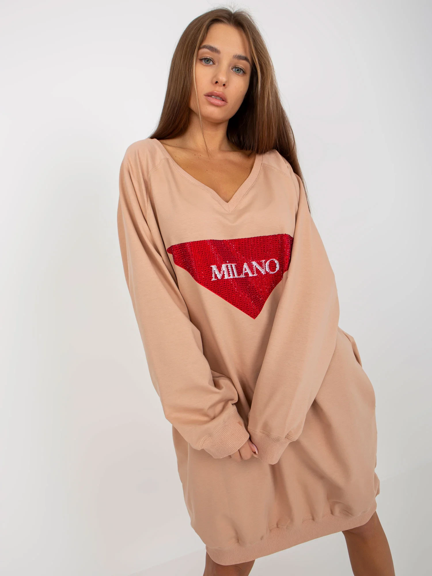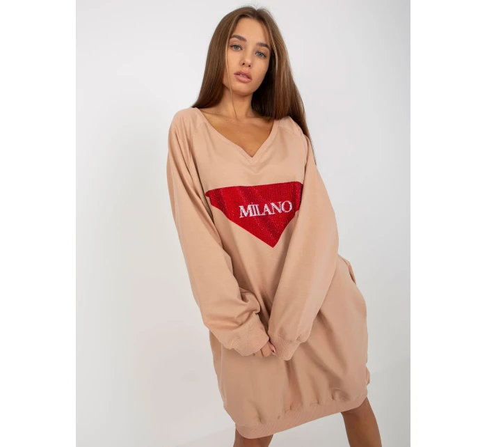 Beżowa długa bluza oversize z aplikacją z dżetów .