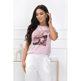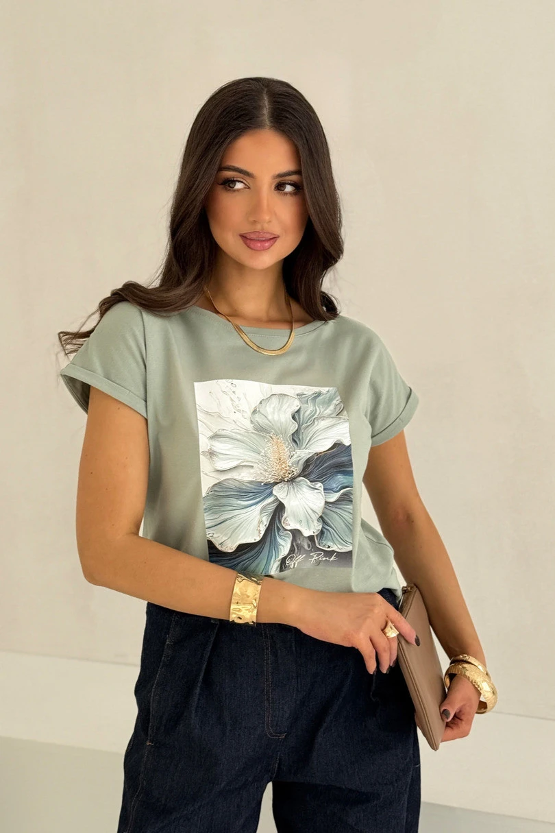 Stylowa bluzka damska z krótkim rękawem to doskonały wybór do codziennych stylizacji. Model posiada klasyczny, prosty fason, który zapewnia wygodę noszenia i sprawia, że bluzka świetnie dopasowuje się do różnych elementów garderoby. Rękawy zakończone są modnym wywinięciem, które nadaje całości lekkości i casualowego charakteru. Na przodzie znajduje się duży nadruk z motywem kwiatowym, wzbogacony o połyskujące elementy, które dodają bluzce wyjątkowego stylu i subtelnej elegancji. T-shirt wykonany został z wysokiej jakości bawełny z dodatkiem elastanu, dzięki czemu materiał jest miękki, oddychający i elastyczny. Zapewnia to komfort noszenia przez cały dzień oraz lepsze dopasowanie do sylwetki. Bluzka świetnie komponuje się z jeansami, spódnicami oraz spodniami materiałowymi, tworząc modne stylizacje na co dzień.