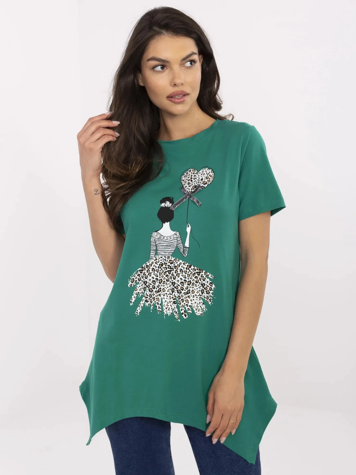 Wymiary bluzki w rozmiarze S mierzone na płasko: szerokość pod pachami - 49 cm, długość rękawa - 19 cm (od szwu), długość całkowita - 74 cm, szerokość w biodrach - 56 cm.
