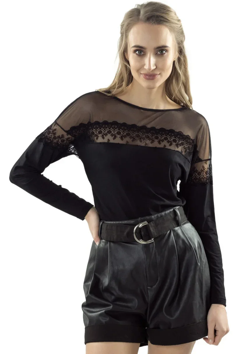 Blouse se sníženou linií ramen. Lem halenky je z tylu, který na zádech tvoří obálkový výstřih. Vložení široké krajky nad poprsím a na rukávech.