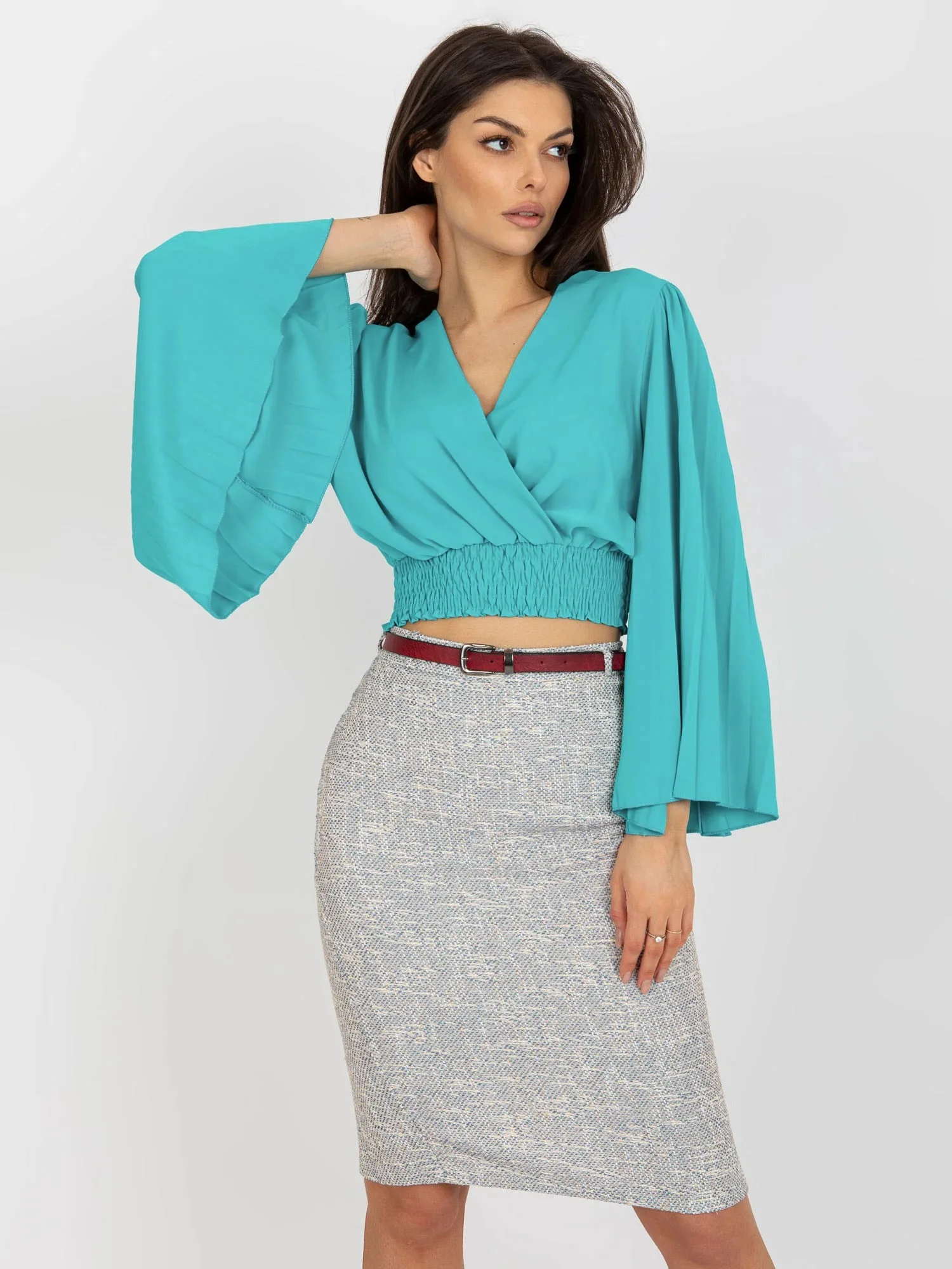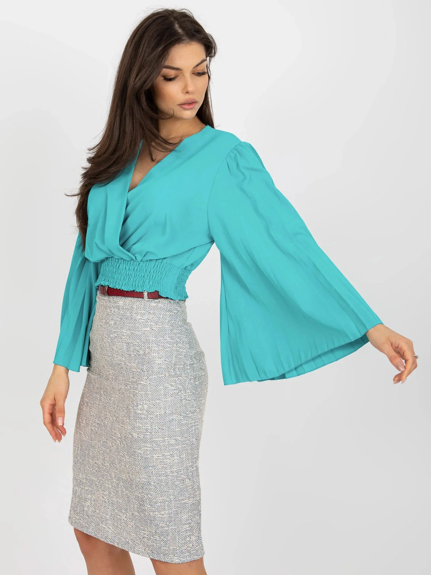 Niebieska bluzka wizytowa z kopertowym dekoltem .