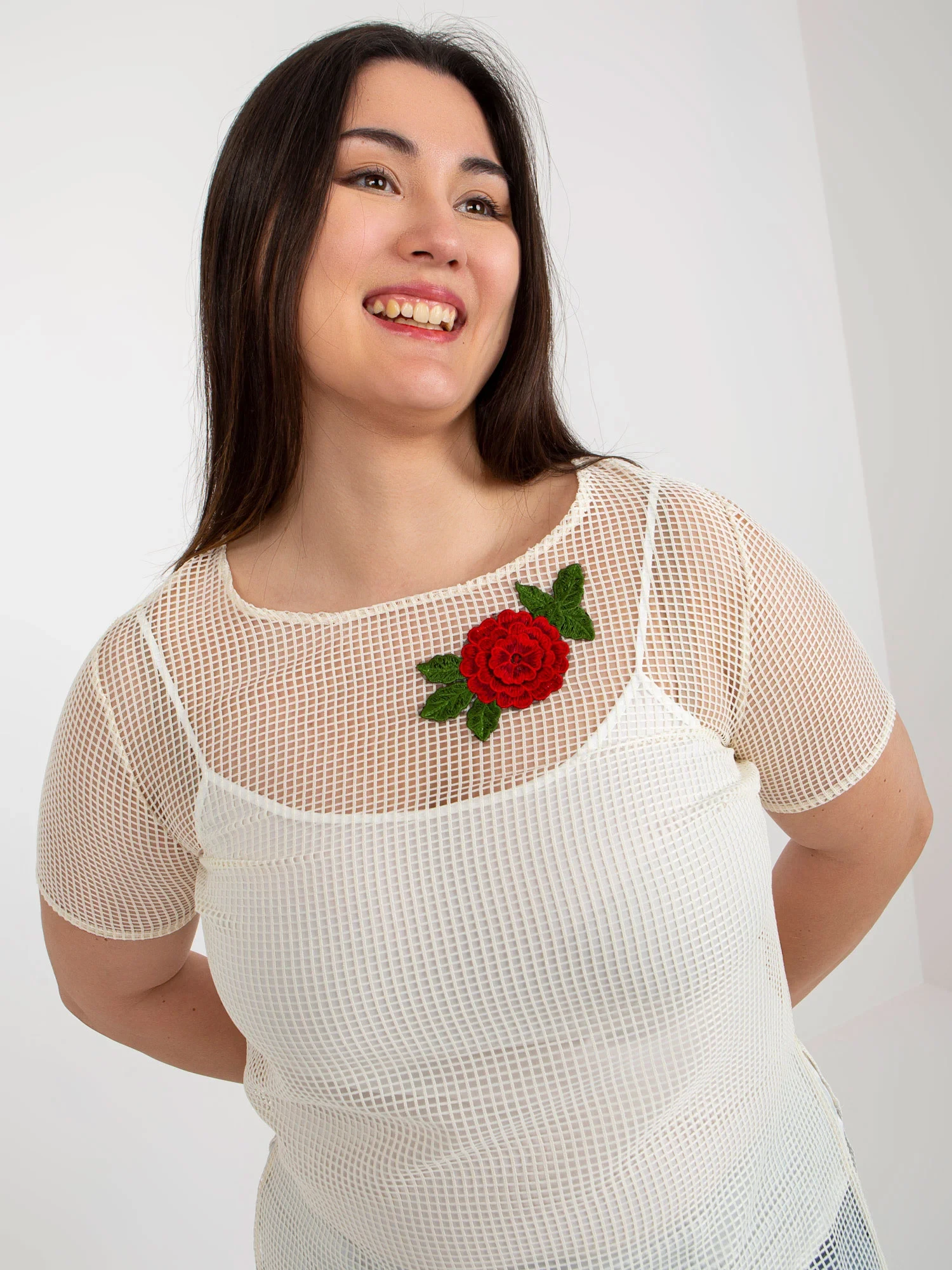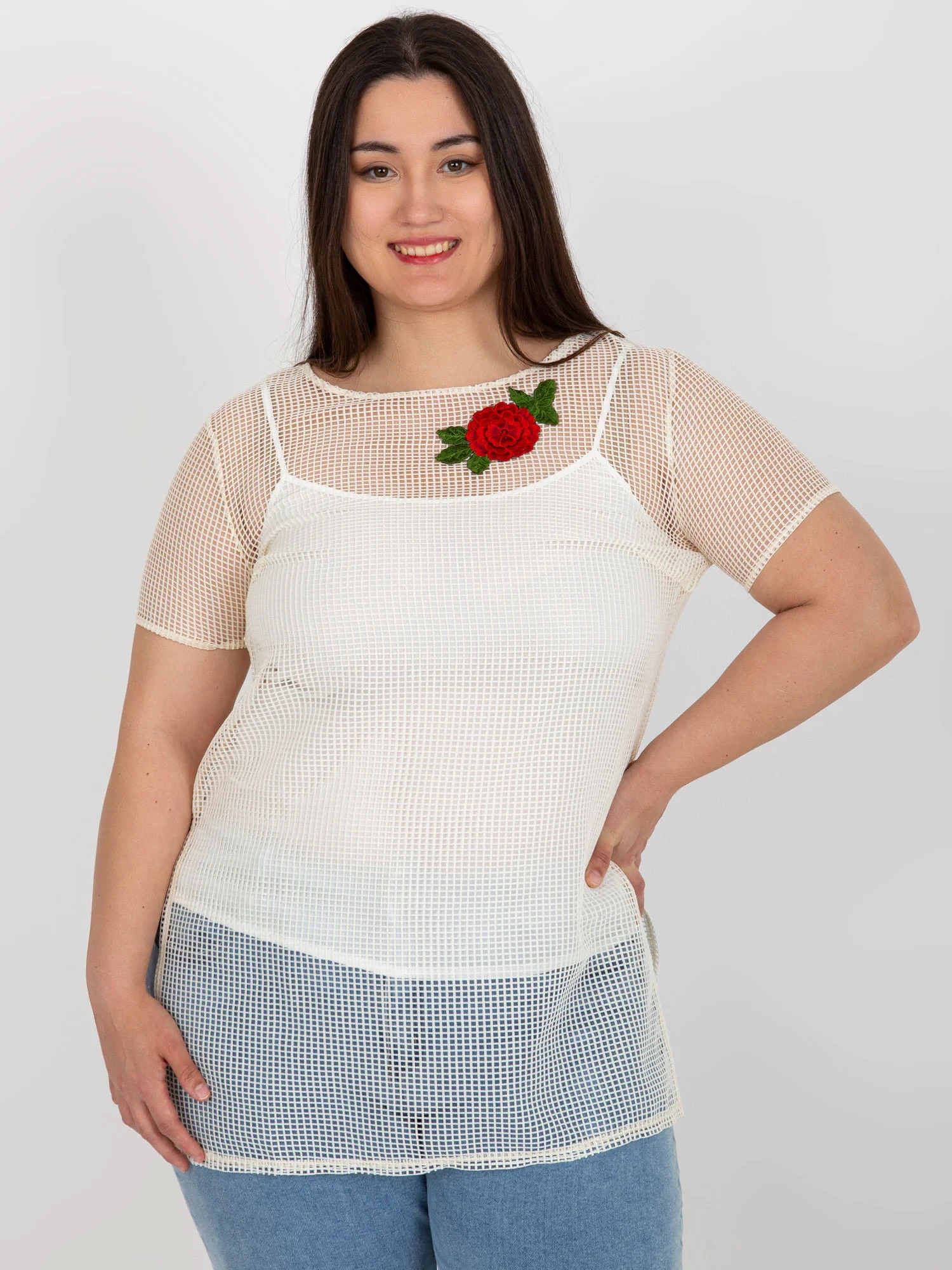 Modelka ma na sobie rozmiar 48. Wymiary modelki: wzrost 167 cm, biust 102 cm, talia 81 cm, biodra 113 cm.