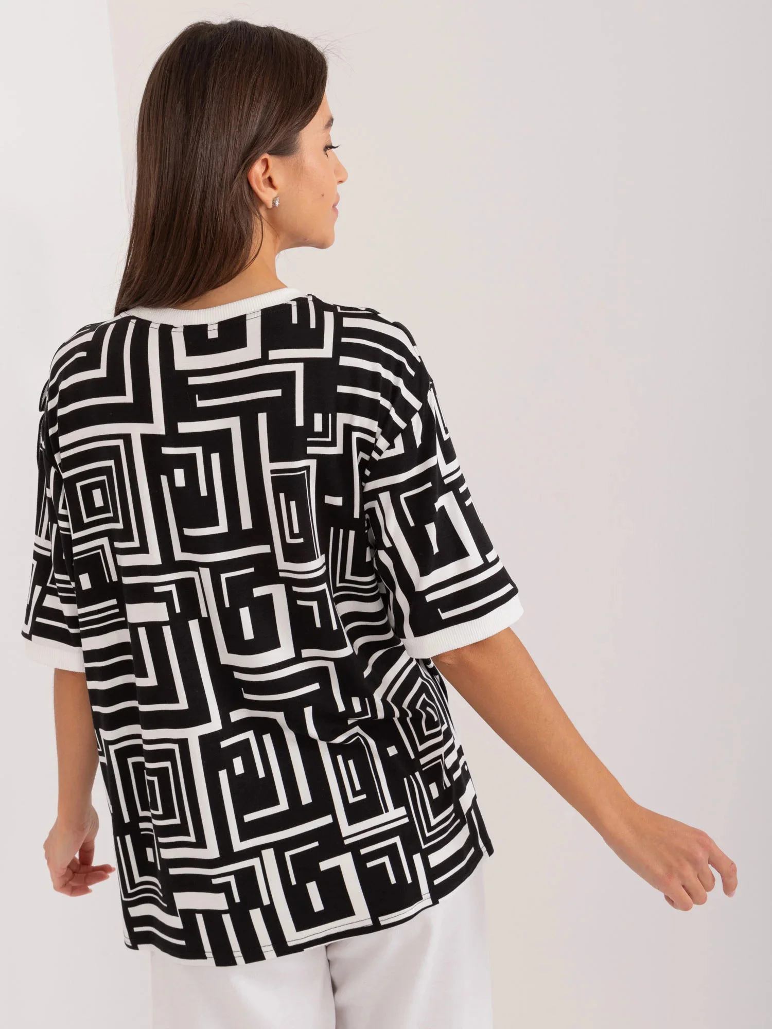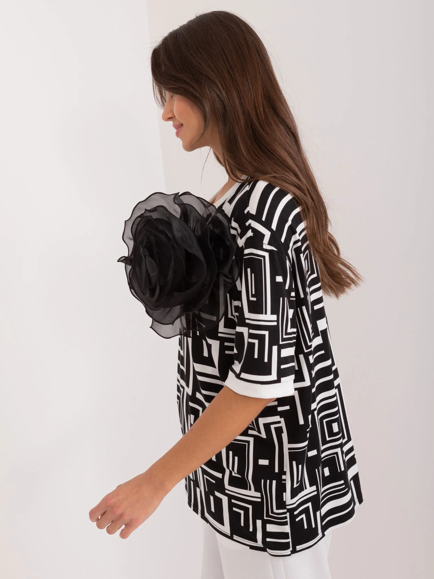 Wymiary bluzki w rozmiarze one size mierzone na płasko: szerokość pod pachami - 56 cm, długość całkowita - 58 cm.