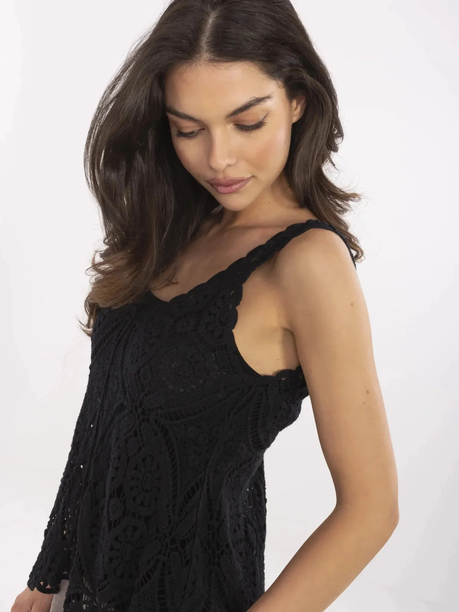 Wymiary topu w rozmiarze one size mierzone na płasko: szerokość pod pachami - 35 cm, długość całkowita - 63 cm, szerokość w biodrach - 40 cm.