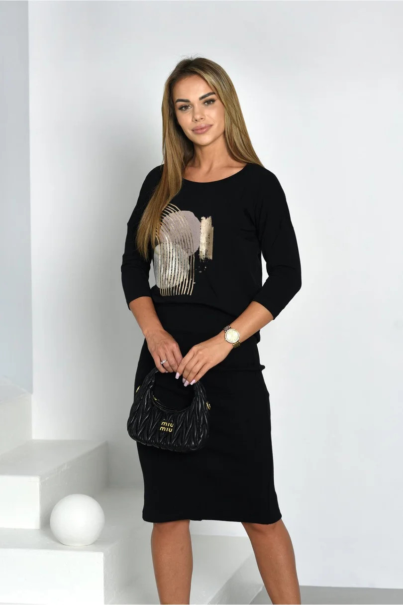Dámská halenka s tříčtvrtečním rukávem a moderním geometrickým potiskem na přední straně.Designóse skládá z abstraktních tvarůótvořících zajímavou, uměleckou kompozici.Zlaté akcenty dodávají halence jemný lesk, který jí dodává na sofistikovanosti.Spodní část halenky je zakončena rovnou linií, kteráóumožňuje různé způsoby nošení–jak zastrčená do kalhot, tak i mimo ně.