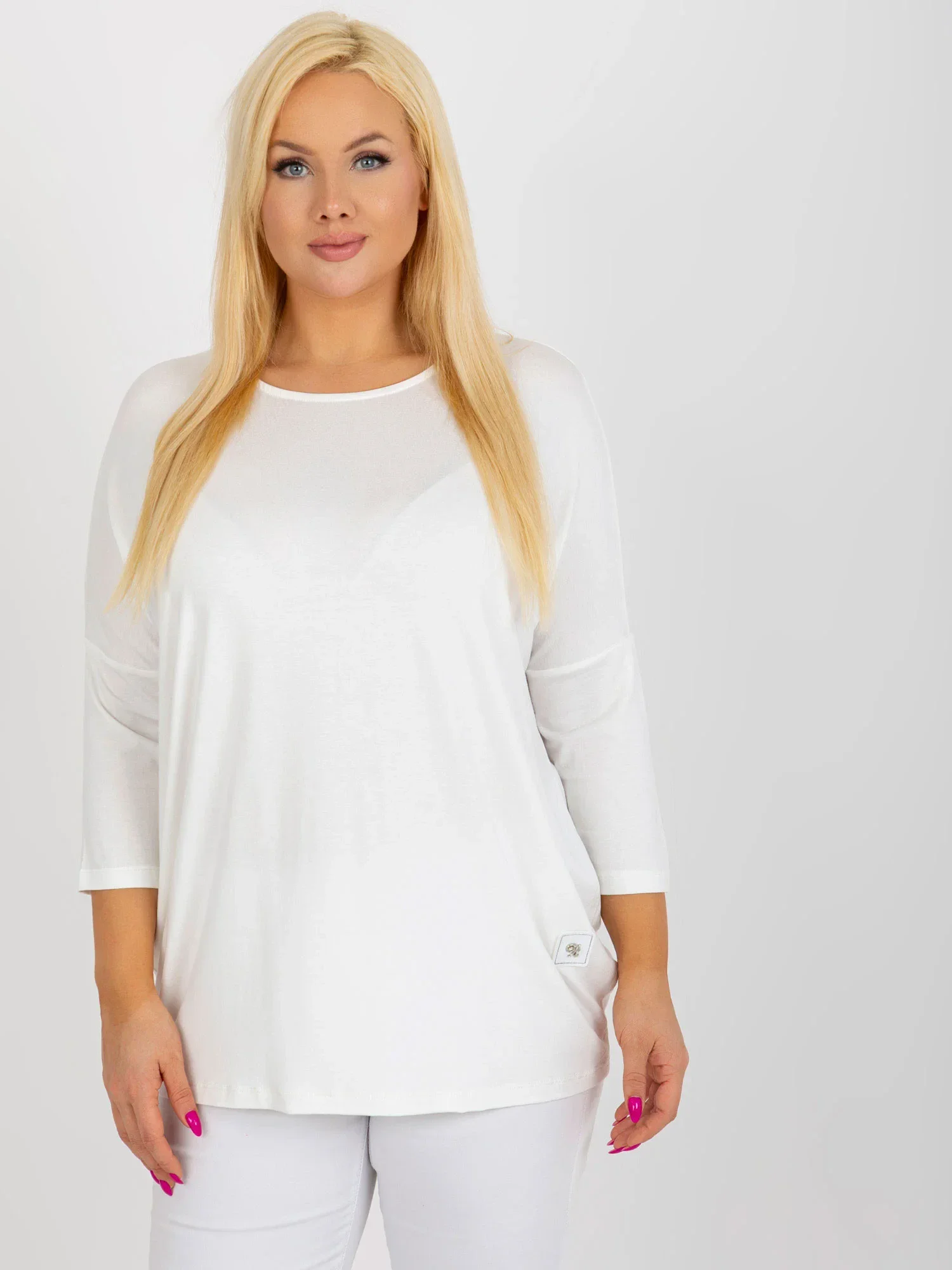 Wymiary bluzki w rozmiarze one size mierzone na płasko: szerokość pod pachami - 70 cm, długość rękawa - 44 cm, długość całkowita - 73 cm .
