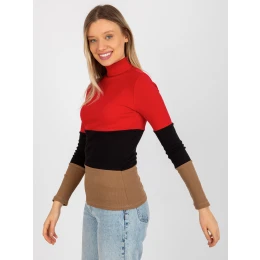 Czerwono-ciemnocamelowa bluzka basic z golfem w prążek .