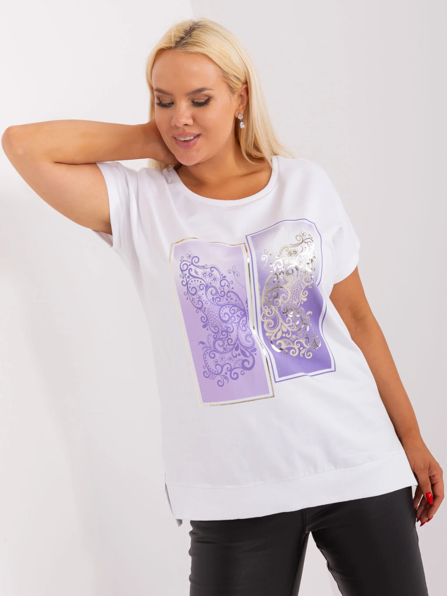 Wymiary bluzki w rozmiarze one size mierzone na płasko: szerokość pod pachami - 59 cm, długość całkowita - 73 cm.