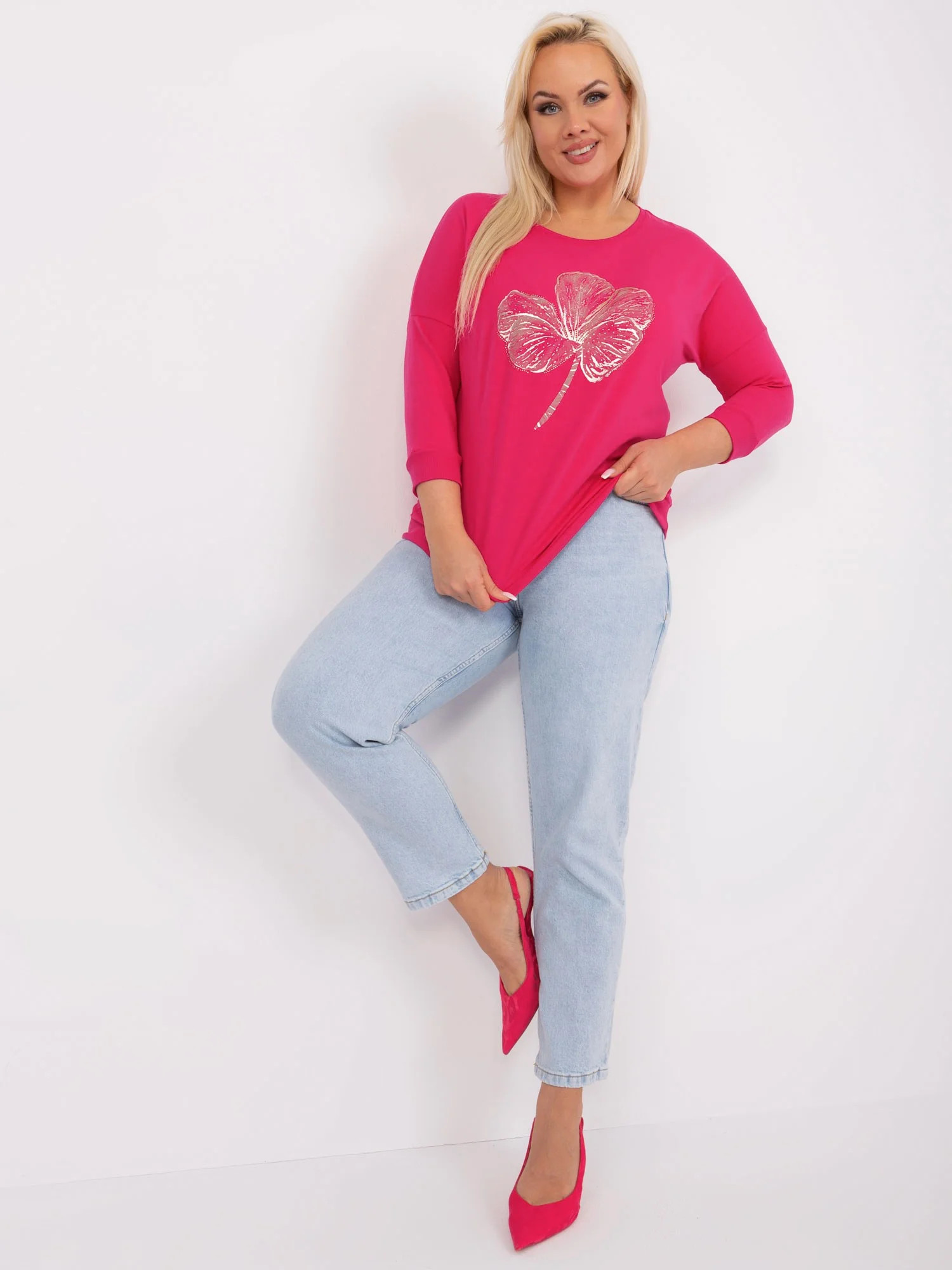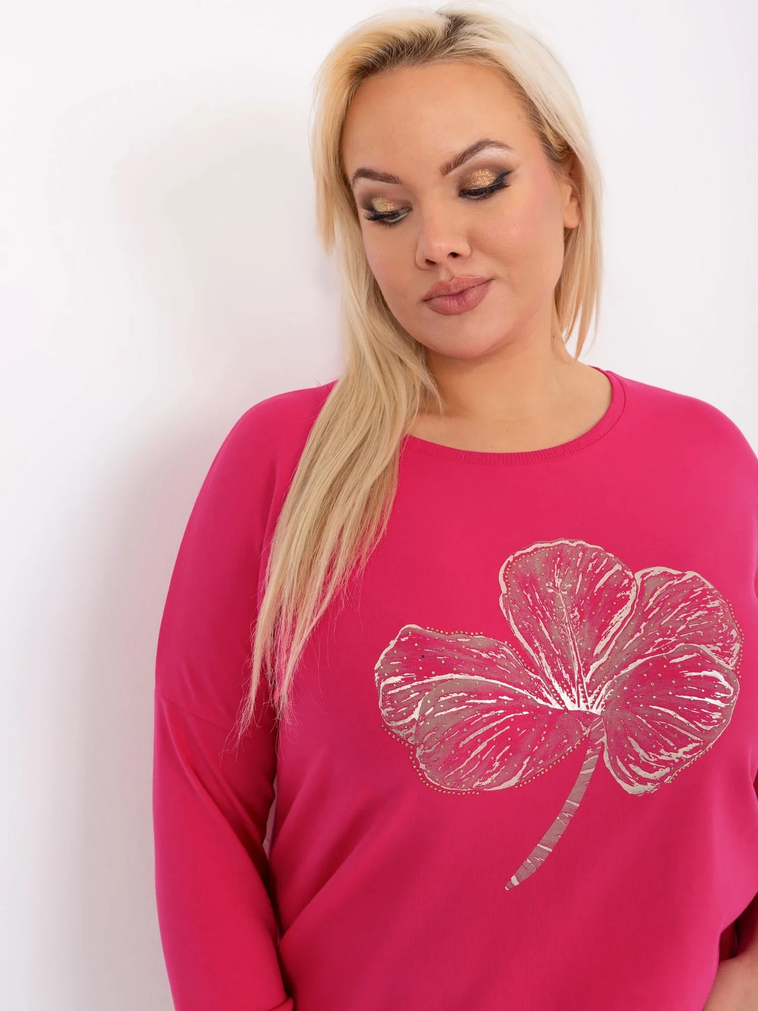 Wymiary bluzki w rozmiarze one size mierzone na płasko: szerokość pod pachami - 59 cm, długość całkowita - 59 cm, długość rękawa - 41 cm