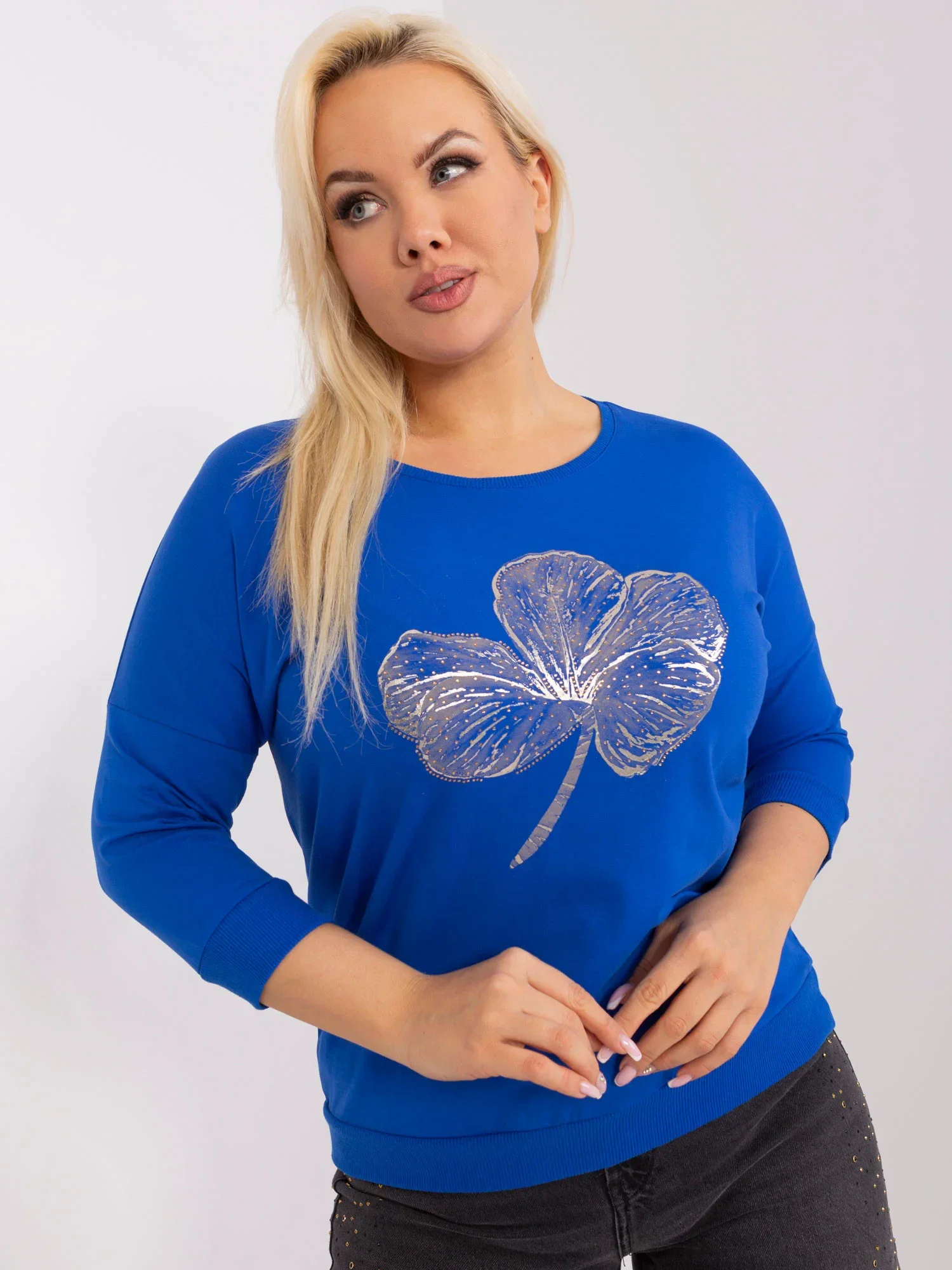 Wymiary bluzki w rozmiarze one size mierzone na płasko: szerokość pod pachami - 59 cm, długość całkowita - 59 cm, długość rękawa - 41 cm