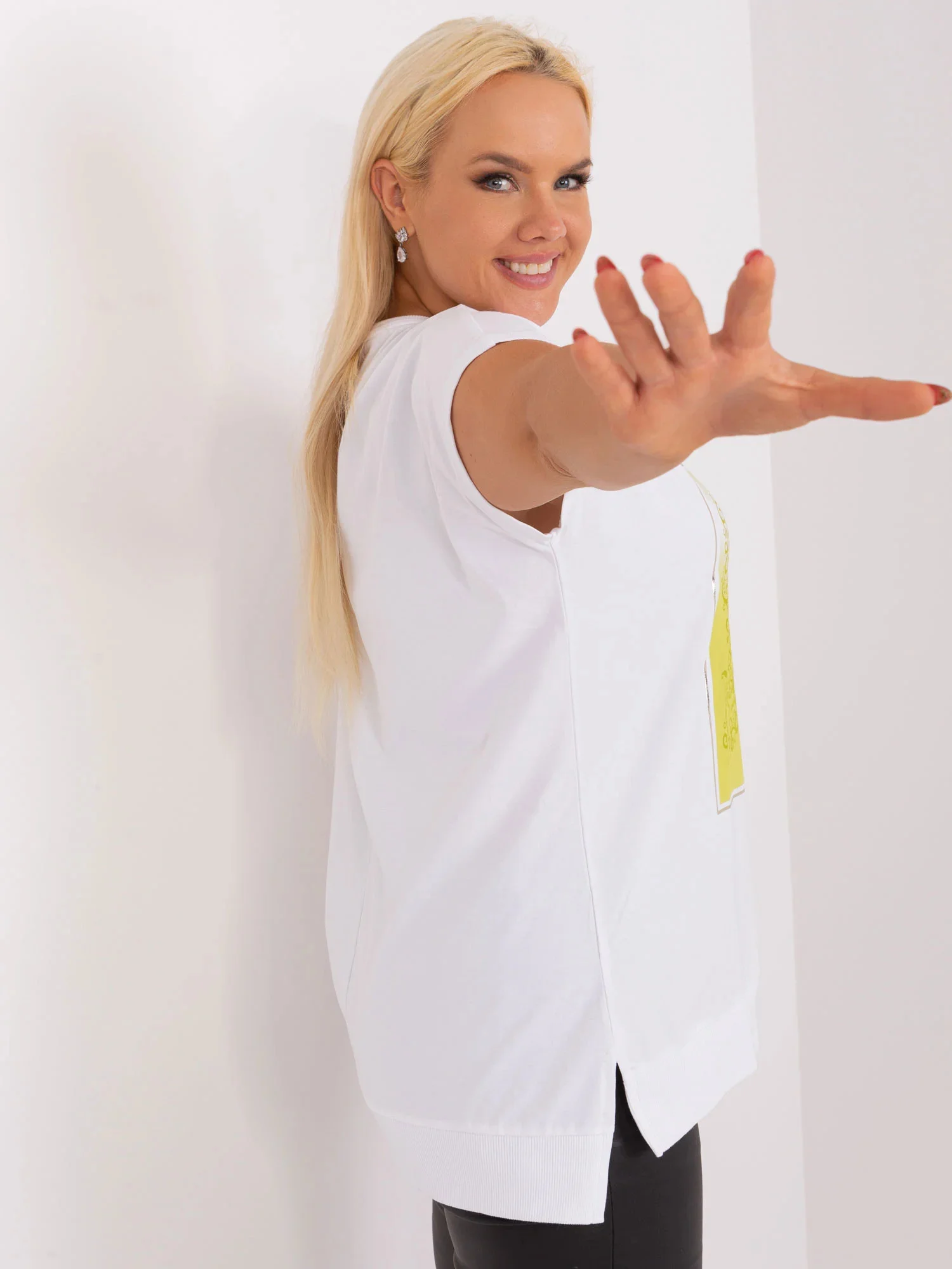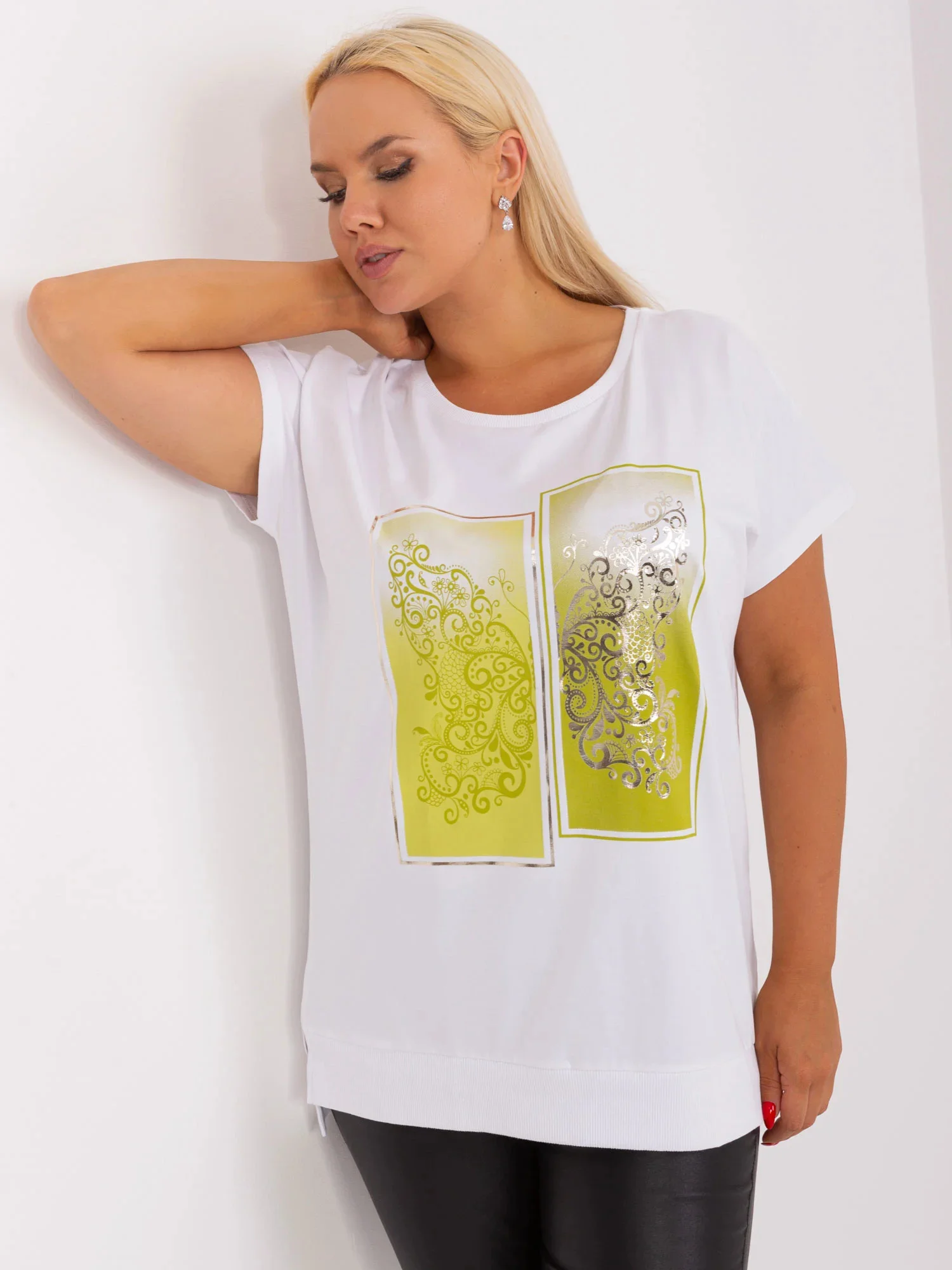 Wymiary bluzki w rozmiarze one size mierzone na płasko: szerokość pod pachami - 59 cm, długość całkowita - 73 cm.