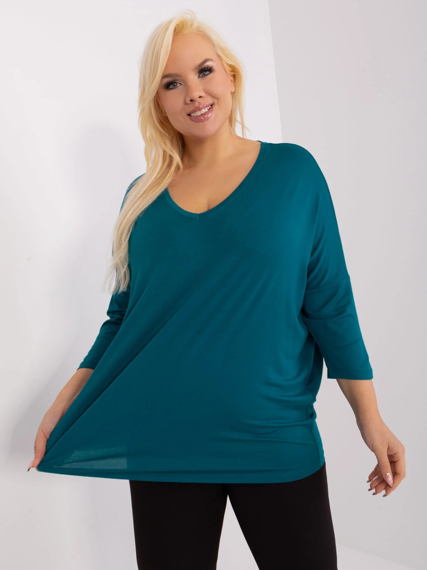 Wymiary bluzki w rozmiarze one size mierzone na płasko: szerokość pod pachami - 74 cm, długość rękawa - 45 cm, długość całkowita - 73 cm .