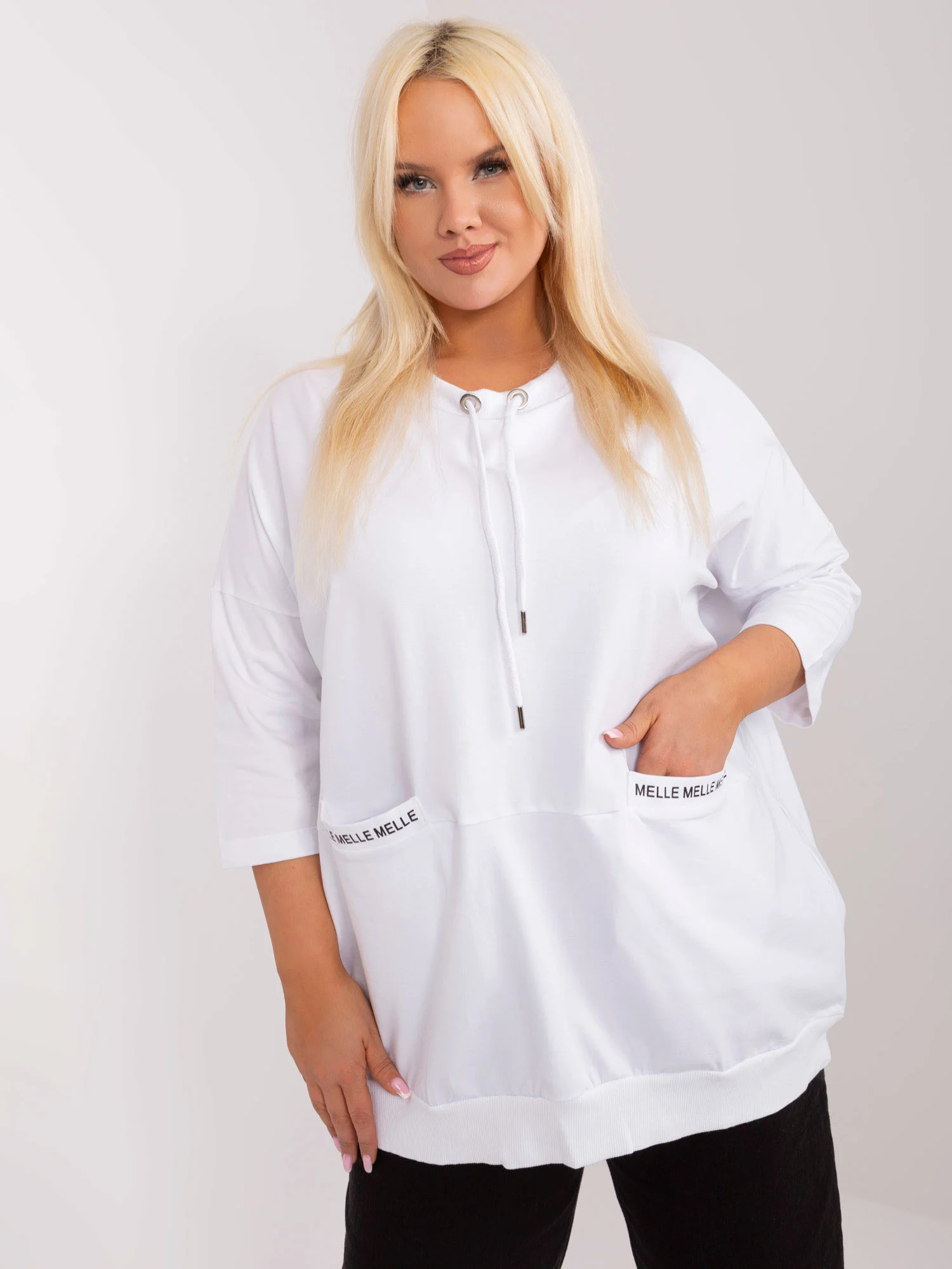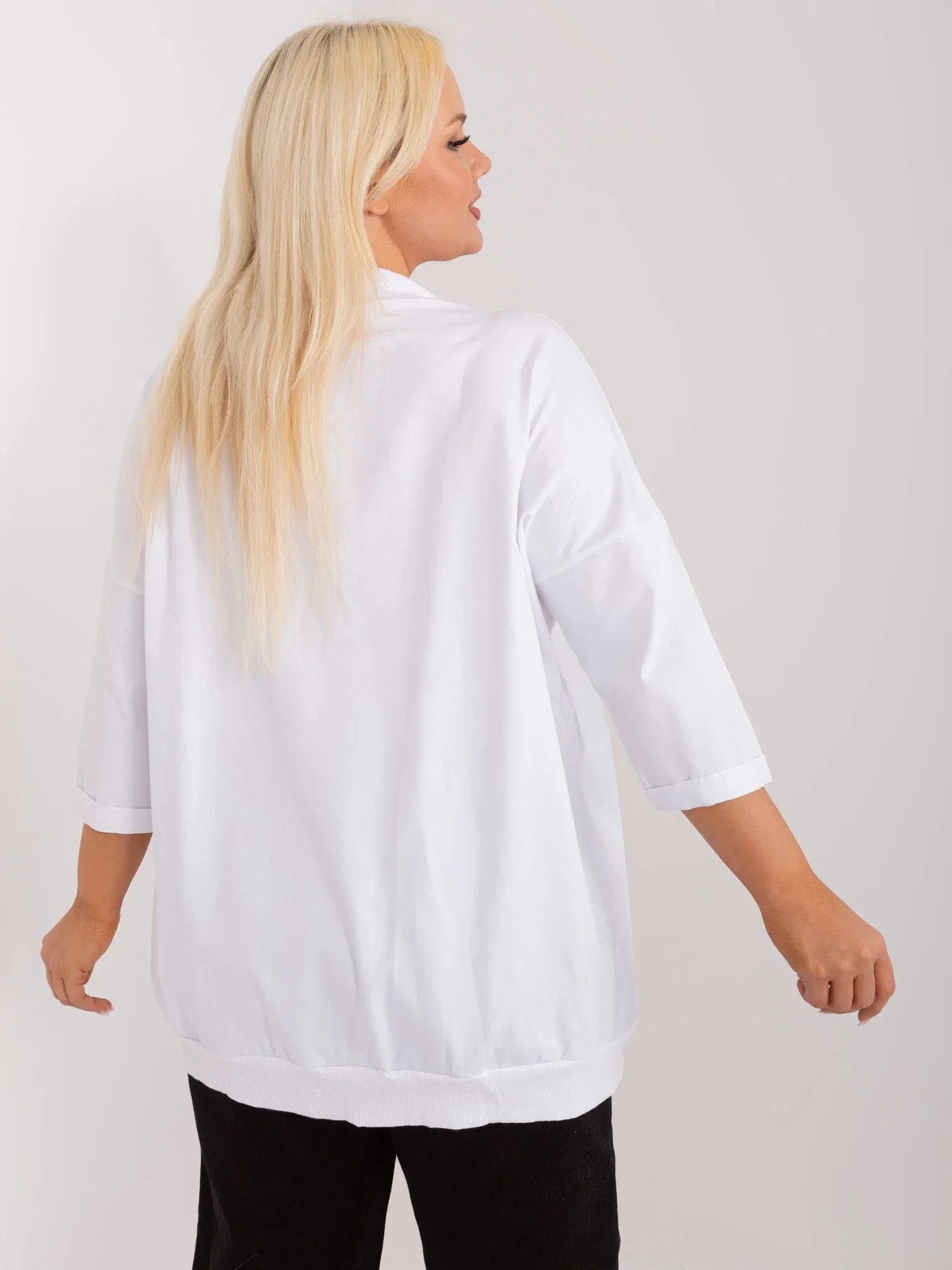 Wymiary bluzy w rozmiarze one size mierzone na płasko: szerokość pod pachami - 76 cm, długość rękawa - 43 cm, długość całkowita - 77 cm .