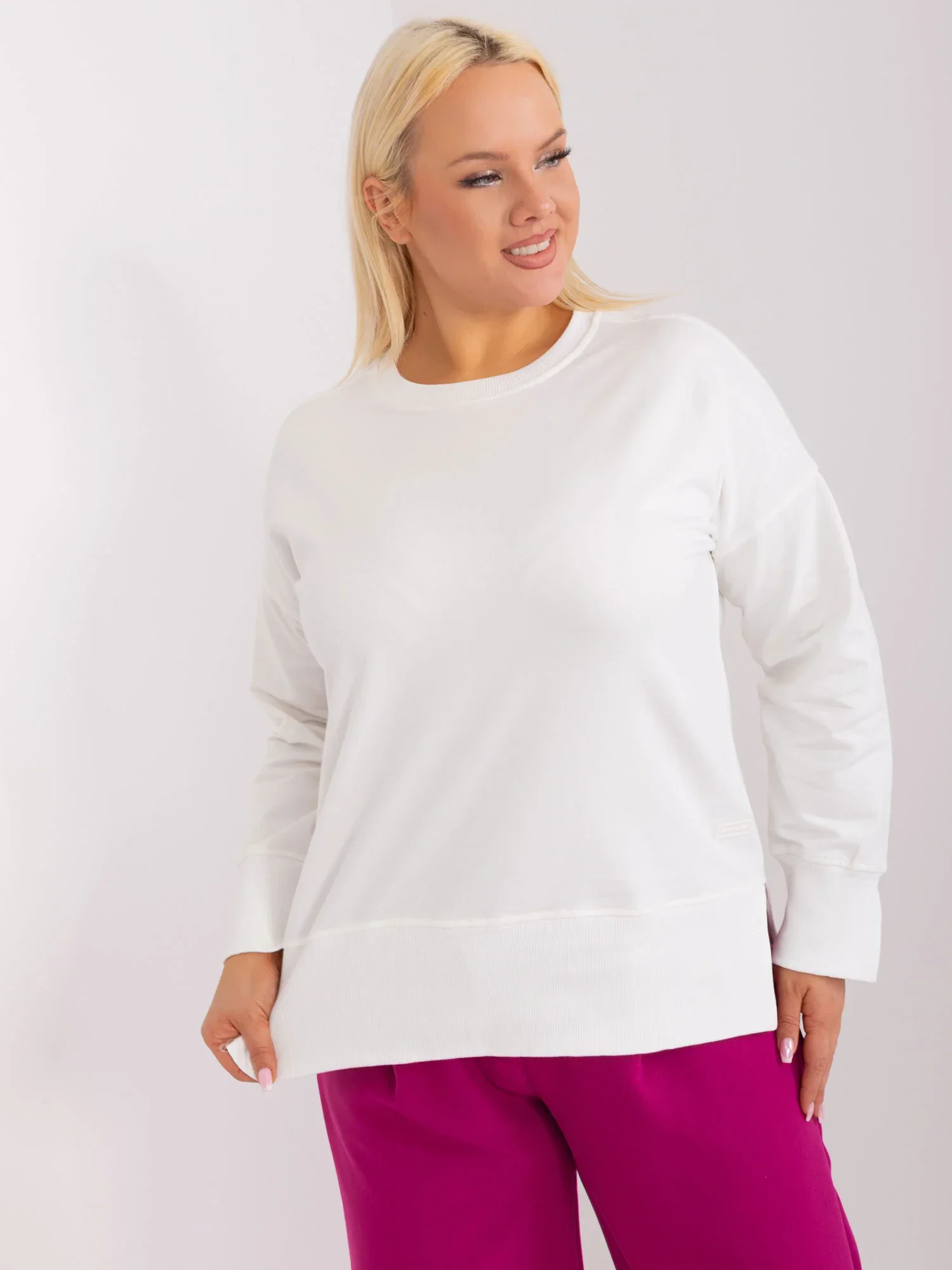 Wymiary bluzy w rozmiarze one size mierzone na płasko: szerokość pod pachami - 62 cm, długość całkowita - 65 cm, długość rękawa - 58 cm.