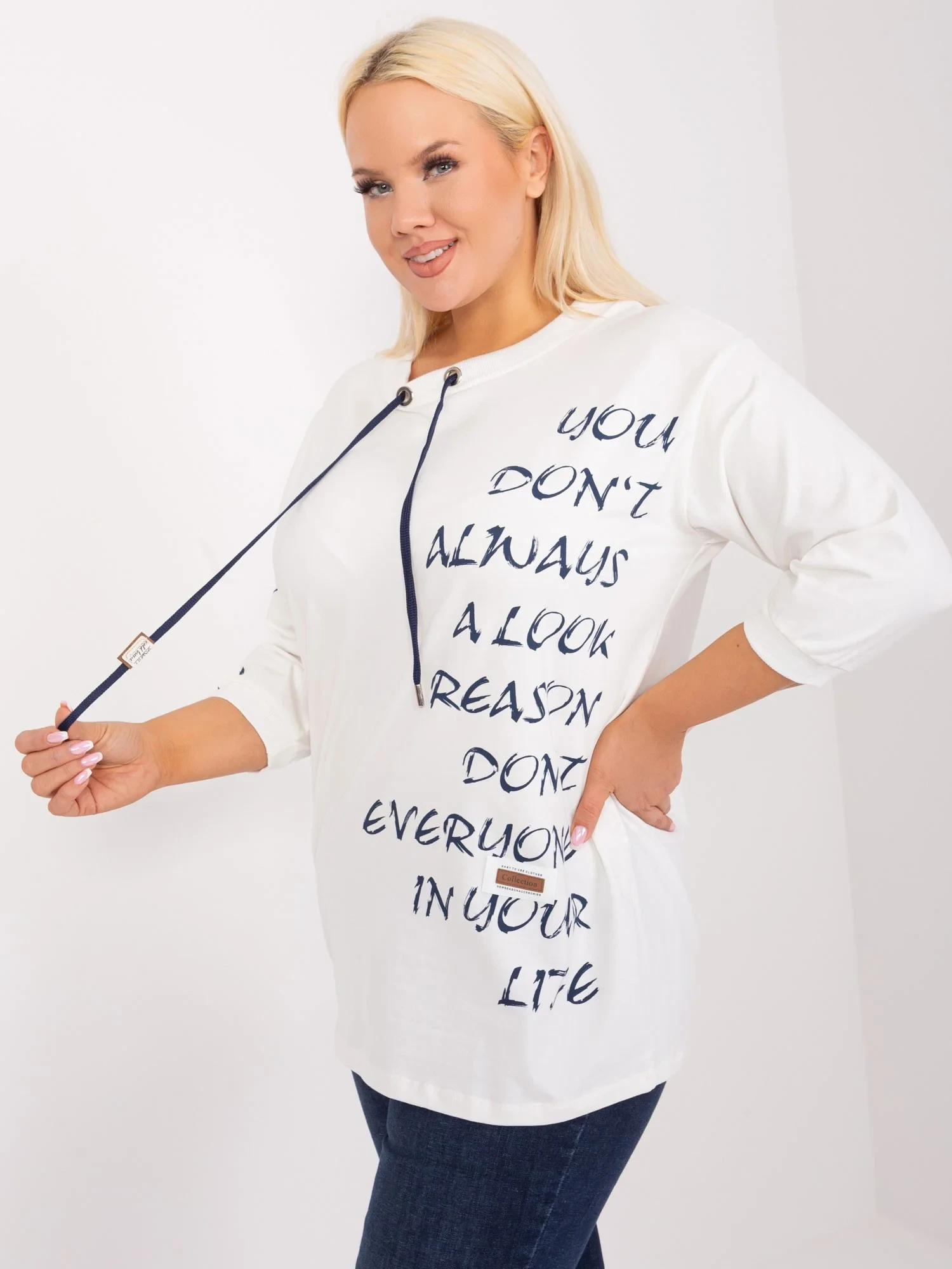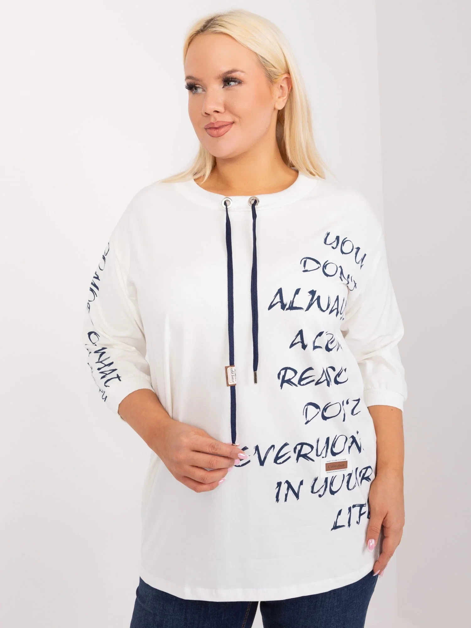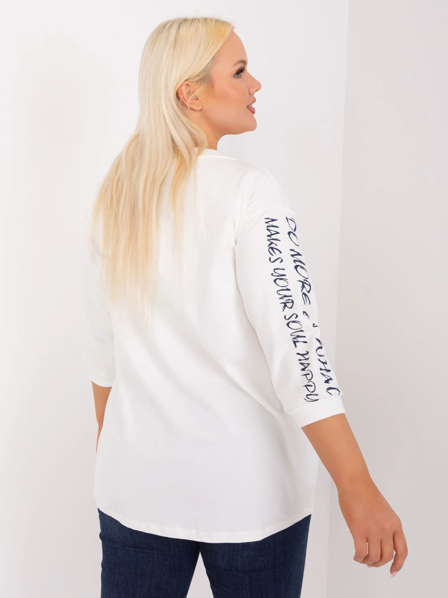 Wymiary bluzki w rozmiarze one size mierzone na płasko: szerokość pod pachami - 60 cm, długość rękawa - 41 cm, długość całkowita - 75 cm .