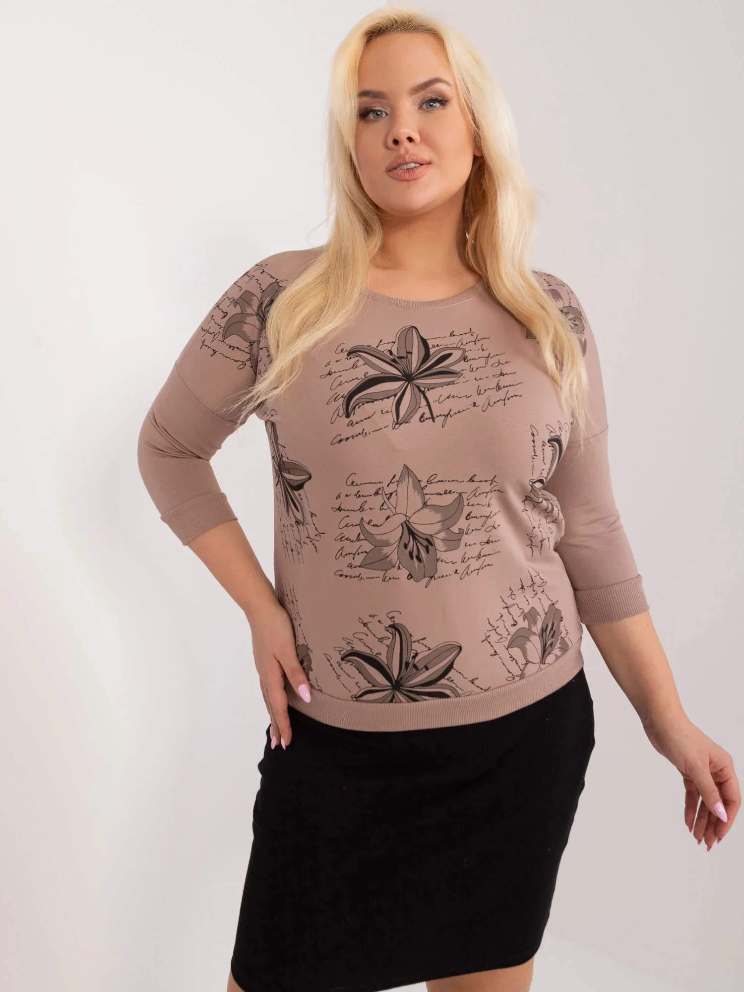 Wymiary bluzki w rozmiarze one size mierzone na płasko: szerokość pod pachami - 62 cm, długość rękawa - 38 cm, długość całkowita - 60 cm .