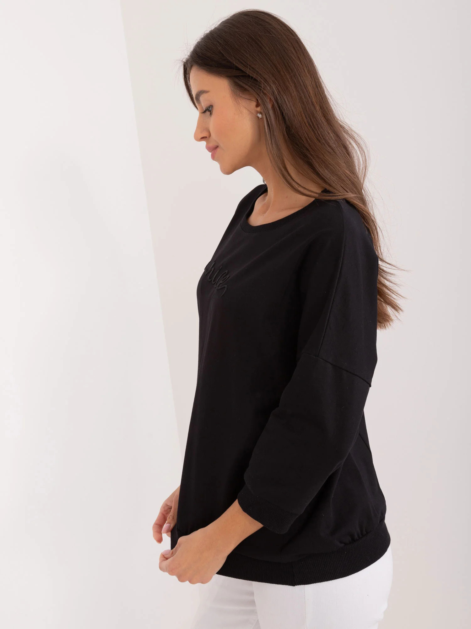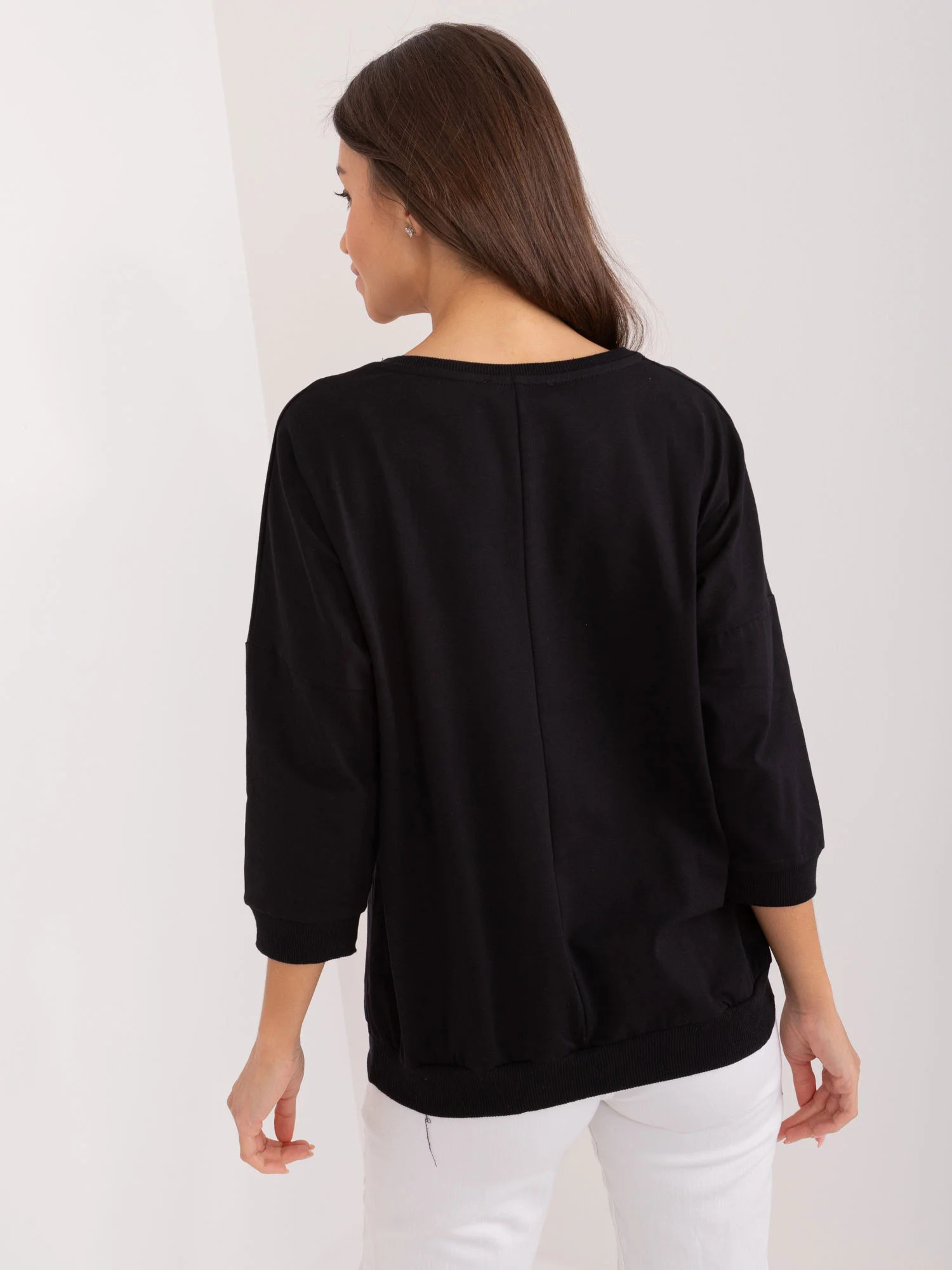 Wymiary bluzki w rozmiarze one size mierzone na płasko: szerokość pod pachami - 60 cm, długość rękawa - 42 cm, długość całkowita - 57 cm.
