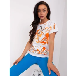 >Biało-pomarańczowa damska bluzka z nadrukiem .