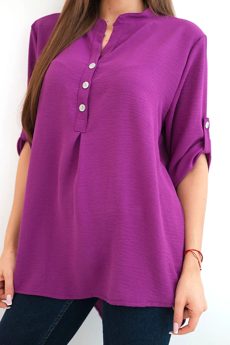 Objevte mimořádnou eleganci a pohodlí v prezentované halence s delšími zády, knoflíkovým výstřihem a ohrnutými rukávy, tato halenka nejen vypadá výjimečně stylově, ale poskytuje také bezkonkurenční funkčnost. Ciťte se sebevědomě a elegantně v halence, která podtrhne váš jedinečný styl. Díky delším zadním dílům vytvoříte jemné a módně nepravidelné proporce a knoflíkový výstřih vám umožní upravit si halenku podle vašich preferencí. Vyhrnuté rukávy dodávají halence lehkost a ležérní charakter, ideální pro různé příležitosti. Ať už se jedná o obchodní jednání nebo relaxační kávu s přáteli, naše halenka vám poskytne pohodlí a styl v jednom. Nenechte si ujít příležitost přidat do svého šatníku tuto jedinečnou halenku! Objevte eleganci, pohodlí a funkčnost v jednom a zdůrazněte svůj jedinečný styl ještě dnes. Velikost je univerzální a bude vhodná pro ženy, které nosí velikost S, M nebo L.