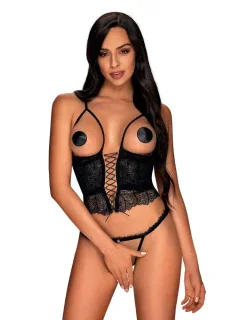 Sexy černé body, které dodá vašemu tělu zvláštní kouzlo! Krásné krajkové košíčky jemně obepínají ňadra, mezi nimiž jsou krásné třpytivé zirkony. Saténové lemování v pase působí smyslně a zvýrazňuje pas. Pásek za krkem je odepínací. Na zádech, nad linií hýždí, je saténová mašlička. Body se pohodlně zavazuje za krkem i na zádech. Skutečné pokušení pro milovnice fascinujícího vzhledu!