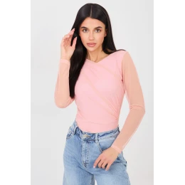 Elegantní body s klasickým, přiléhavým střihem, ideální pro stylové a ženské outfit. Model je vyroben z hladkého materiálu z polyesteru s přídavkem elastanu, který zajišťuje pohodlí nošení a skvělé přizpůsobení postavě. Kulatý výstřih a dlouhé rukávy dodávají celku nadčasový charakter. Přední část body zdobí efektní záhyby, které jemně zdůrazňují postavu a dodávají eleganci. Model má podšívku na celé délce, s výjimkou rukávů, což zvyšuje pohodlí a estetiku nošení. Zapínání na háčky v rozkroku zajišťuje praktičnost a funkčnost. Body se skvěle hodí jak do elegantních, tak do večerních outfitů.