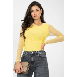 Elegantní body s klasickým, přiléhavým střihem, ideální pro stylové a ženské outfit. Model je vyroben z hladkého polyesterového materiálu s přídavkem elastanu, který zajišťuje pohodlí nošení a skvělé přizpůsobení postavě. Kolečkový výstřih a dlouhé rukávy dodávají celku nadčasový charakter. Přední část body zdobí efektní záhyby, které jemně zdůrazňují postavu a dodávají eleganci. Model má podšívku po celé délce, s výjimkou rukávů, což zvyšuje pohodlí a estetiku nošení. Zapínání na háčky v rozkroku zajišťuje praktičnost a funkčnost. Body se skvěle hodí jak do elegantních, tak večerních outfitů.