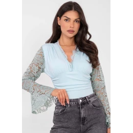 Elegantní body vyrobené z kombinace polyesteru a elastanu, spojující pohodlí s rafinovaným stylem. Model s standardní délkou a výstřihem do V zdůrazňuje siluetu a dodává celku jemně ženský charakter. Dlouhý rozšířený rukáv s krajkou přidává lehkost a eleganci, zatímco ozdobné záhyby na materiálu na přední straně tvoří stylový detail, který body vyzdvihuje. Vložené zpevněné košíčky a praktické zapínání na háčky zajišťují vysokou funkčnost, usnadňující oblékání a svlékání. Dominantní hladký vzor činí z body univerzální kousek, ideální jak na zvláštní příležitosti, tak do elegantních každodenních outfitů.