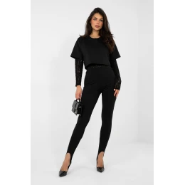 Dvouvrstvé tělo v casual stylu je kombinací pohodlí a ženské estetiky. Model se vyznačuje různorodou texturou materiálu, která dodává celku moderní charakter. Vyrobené z kombinace polyesteru, viskózy a elastanu je tělo elastické, měkké a pohodlné na nošení. Tělo má standardní délku a klasický, kulatý výstřih. Dlouhé krajkové rukávy a krajková spodní vrstva dodávají lehkost a subtilní eleganci, zatímco vrchní vrstva ve formě krátké košile s krátkým rukávem vytváří efekt stylového, vrstveného looku. Model se zapíná na háčky a zajišťuje pohodlí při nošení a dobré přiléhání. Jedná se o ideální volbu pro každodenní outfit, jak s džíny, tak s sukní.