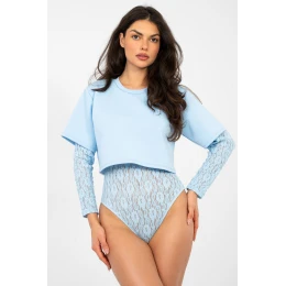 Dvouvrstvové tělo v casual stylu je spojením pohodlí a ženské estetiky. Model se vyznačuje různorodou texturou materiálu, která dodává celku moderní charakter. Vyrobené z kombinace polyesteru, viskózy a elastanu je tělo elastické, měkké a pohodlné na nošení. Tělo má standardní délku a klasický, kulatý výstřih. Dlouhé krajkové rukávy a krajková spodní vrstva dodávají lehkost a jemnou eleganci, zatímco vrchní vrstva ve formě krátké košile s krátkým rukávem vytváří efekt stylového, vrstveného vzhledu. Model s háčky zaručuje pohodlí nošení a dobrou vestavbu. Ideální volba pro každodenní stylizace jak s džíny, tak s sukní.