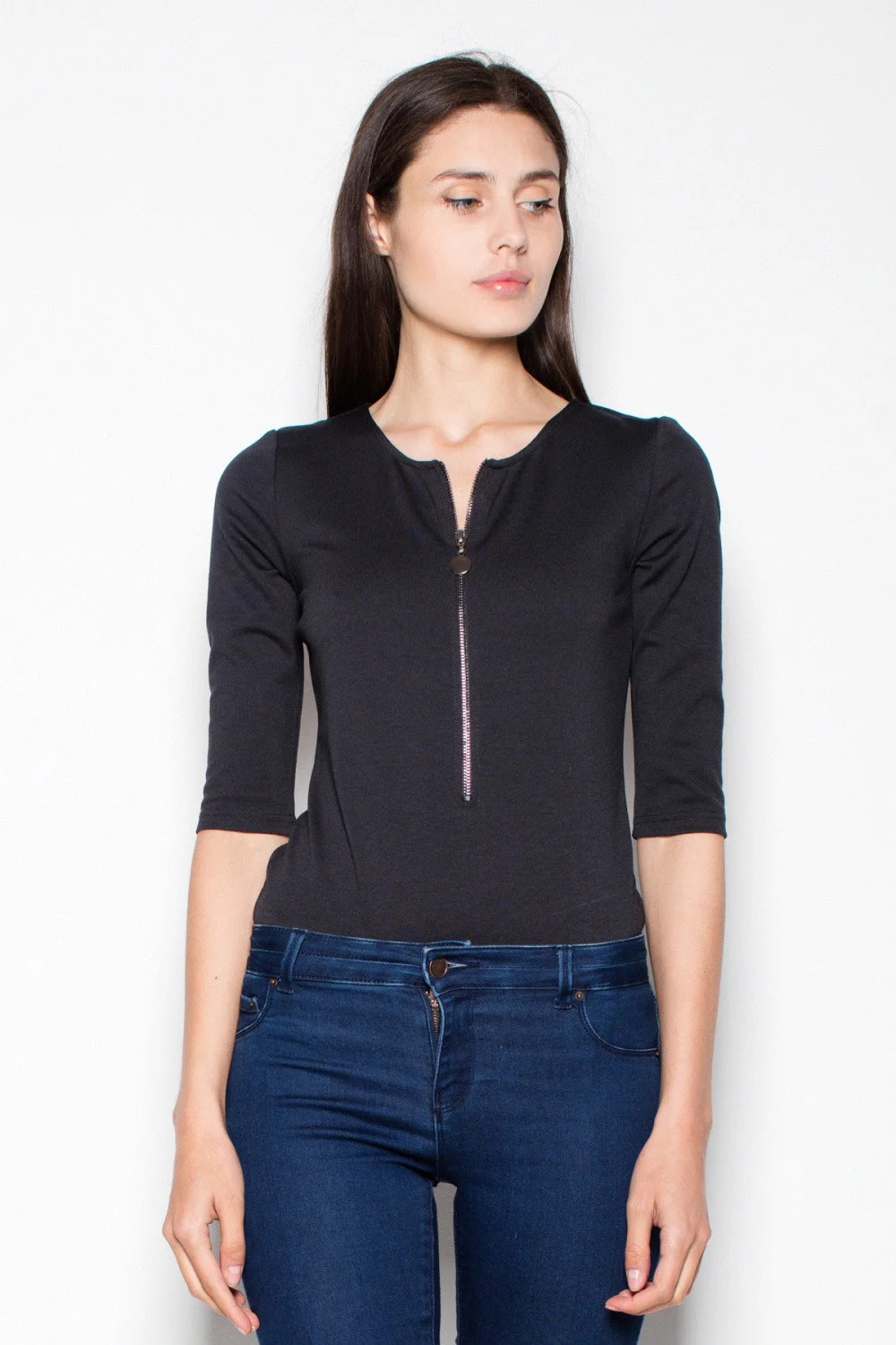 Přiléhavé, ženské body s 3/4 rukávy. Zapíná se na ozdobný zip. Ideální k džínám.