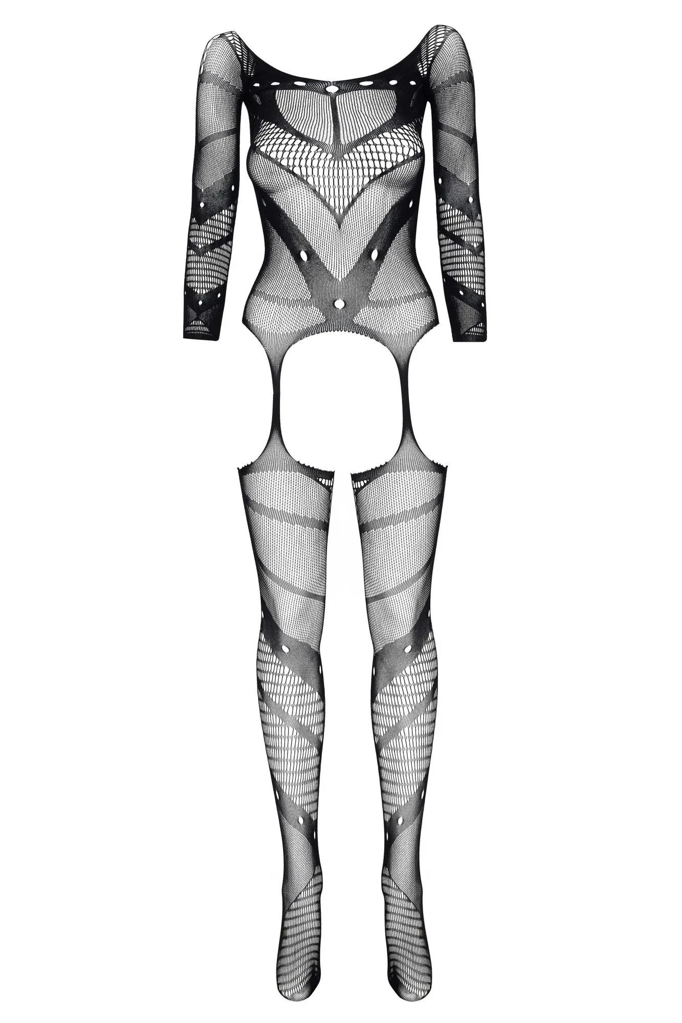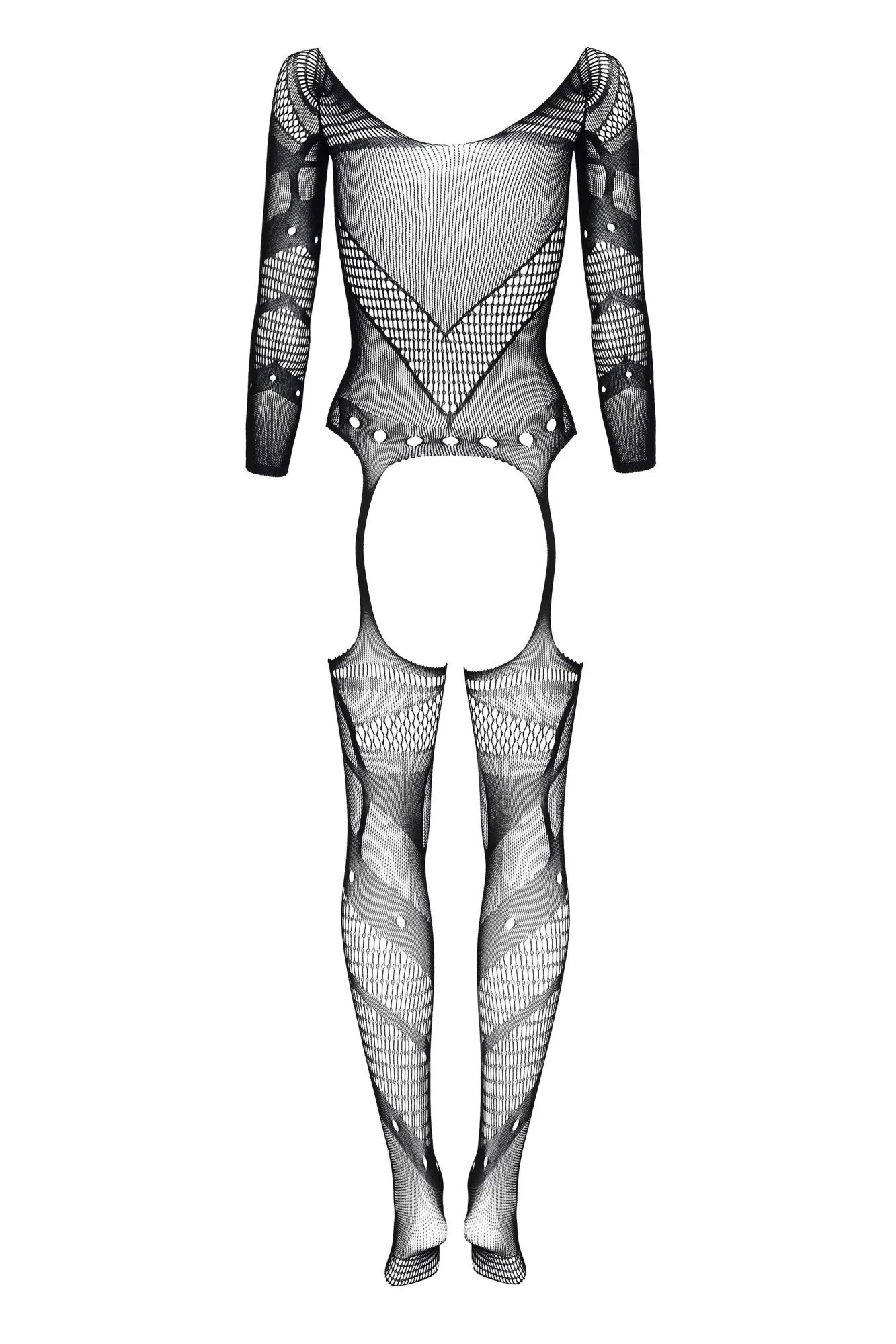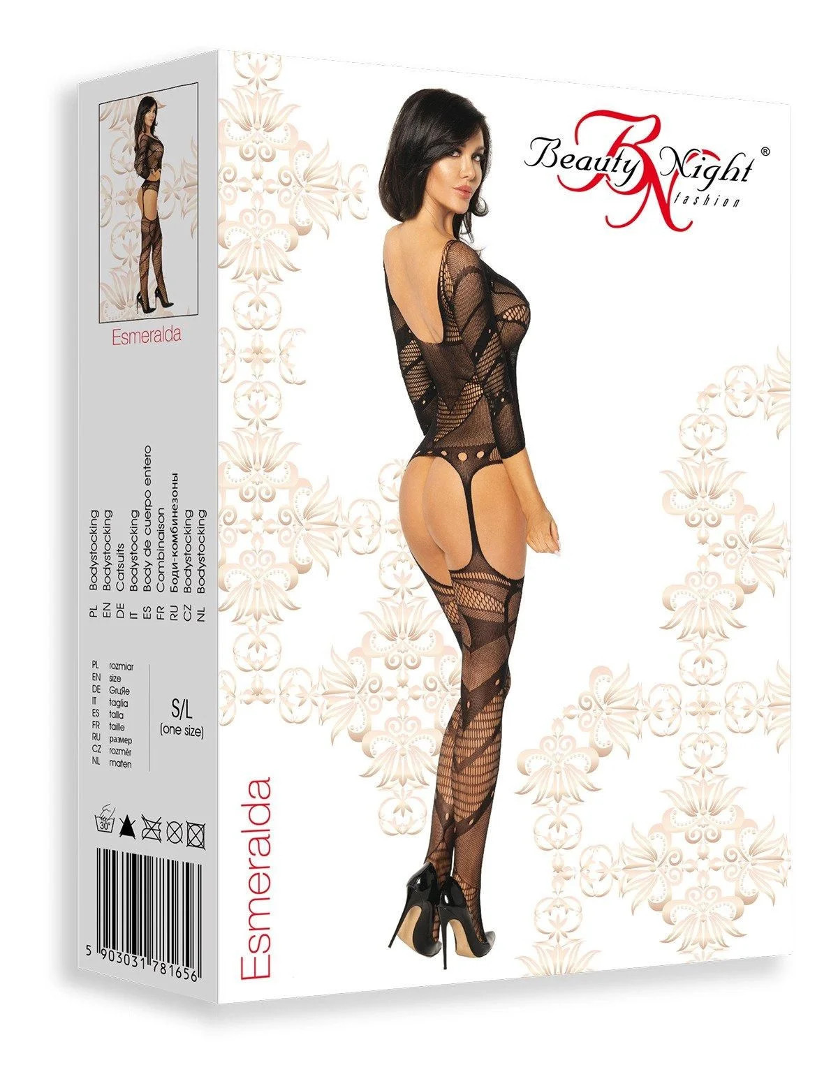 Bodystocking Esmeralda BEAUTY NIGHT FASHION - černá barva - tříčtvrteční rukávy - z průsvitné síťoviny - otevřený rozkrok