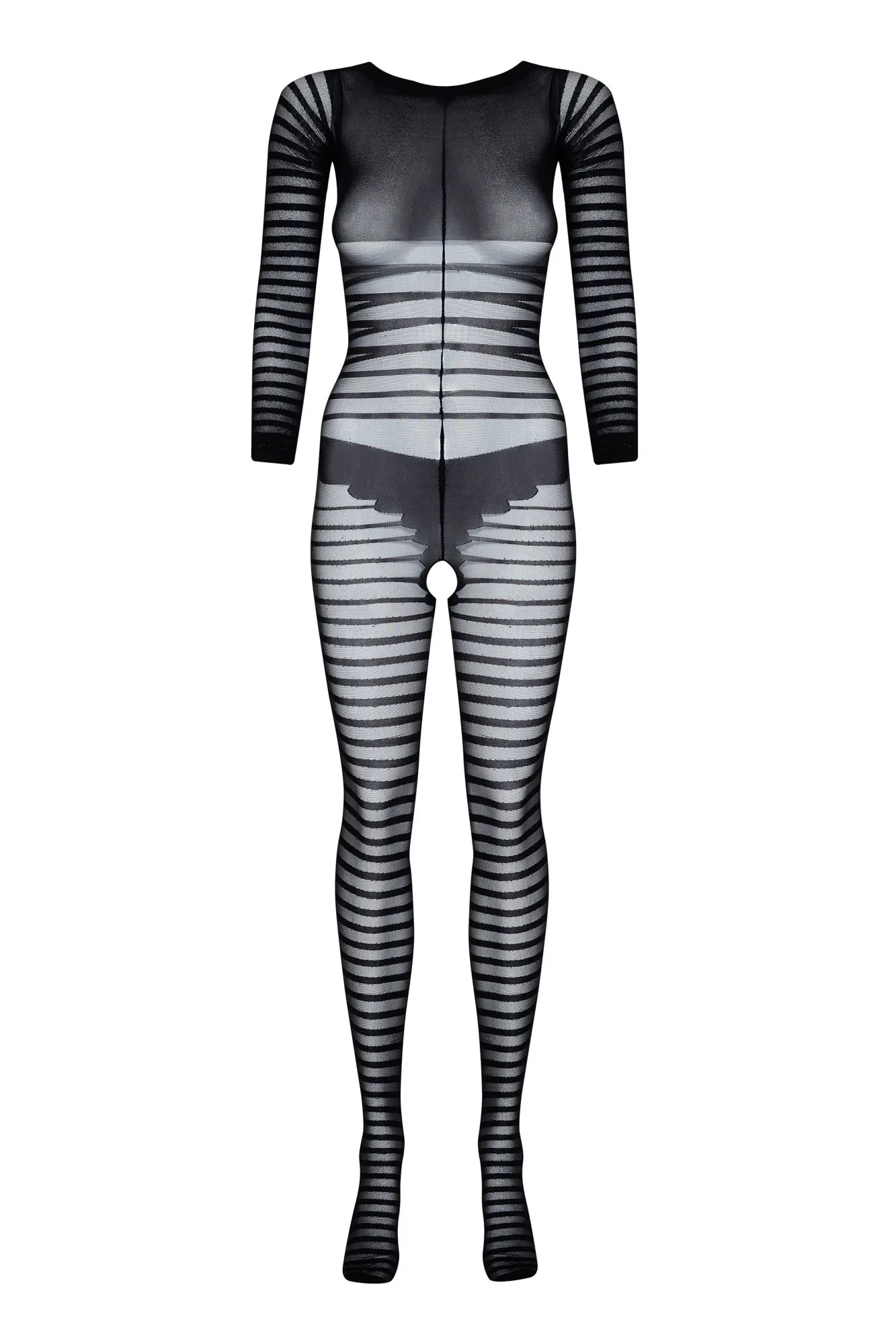 Bodystocking Ximena BEAUTY NIGHT FASHION - černá barva - dlouhé rukávy - z průsvitné síťoviny zdobenou pruhy - otevřený rozkrokMateriálové složení: 90% polyamid + 10% elastan