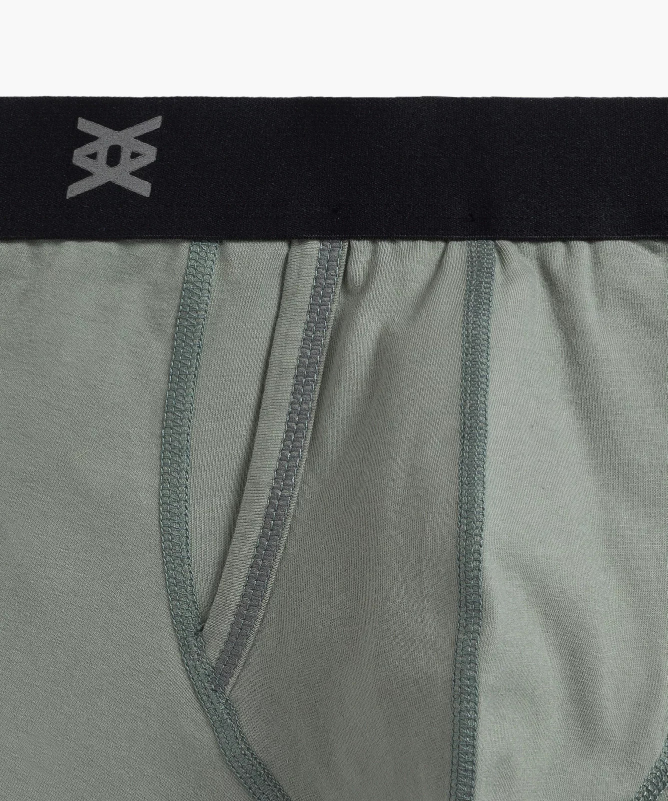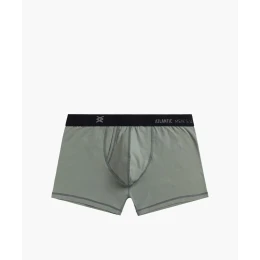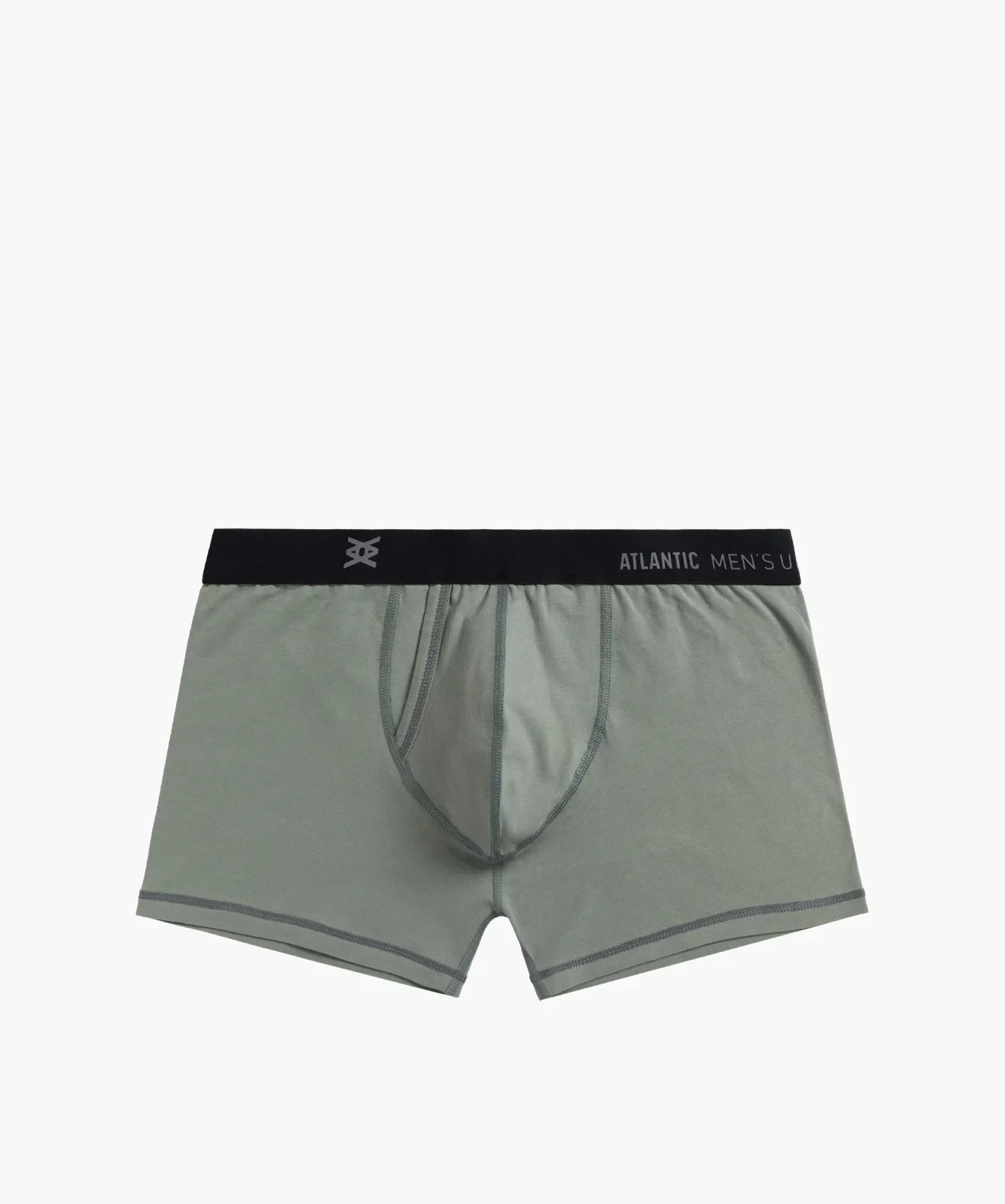 Obcisłe bokserki męskie w jasnym odcieniu khaki mają sportowy charakter. Ich nogawki mają długość do połowy uda, a talia jest niska i wykończona nieuciskającą gumą zewnętrzną. Na niezwykle miękkiej i przyjemnej w dotyku gumie znajduje się odbijający światło nadruk z logo Atlantic. Detalem zwracającym uwagę są także kontrastowe szwy.