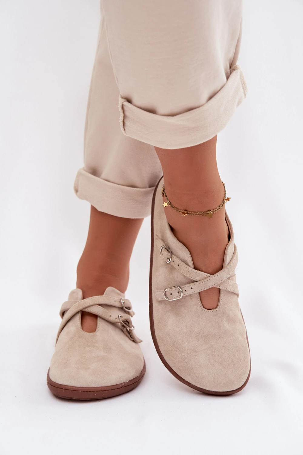 Boty pro dámy vyrobené z přírodního semiše ve stylu Barefoot jsou skvělou volbou pro ženy, které ocení přirozený pohyb nohy a maximální pohodlí. Elastická, plochá podrážka a anatomický tvar umožňují noze pracovat přirozeným způsobem, což zajišťuje pohodlí po celý den. Vepředu jsou dva se překrývající pásky, které dodávají jemný ženský charakter a jemně zdůrazňují nohu. Tento model se skvěle hodí do každodenních stylizací. materiál přírodní semišová kůže