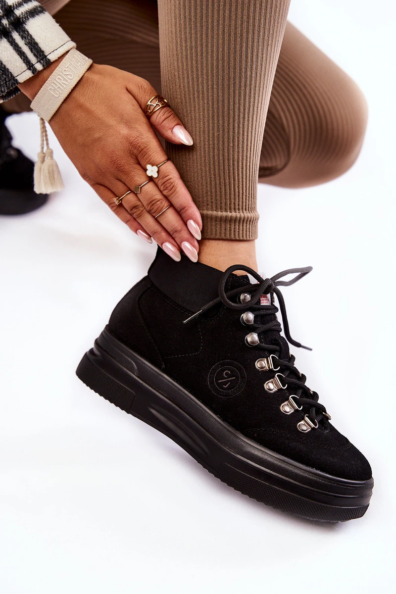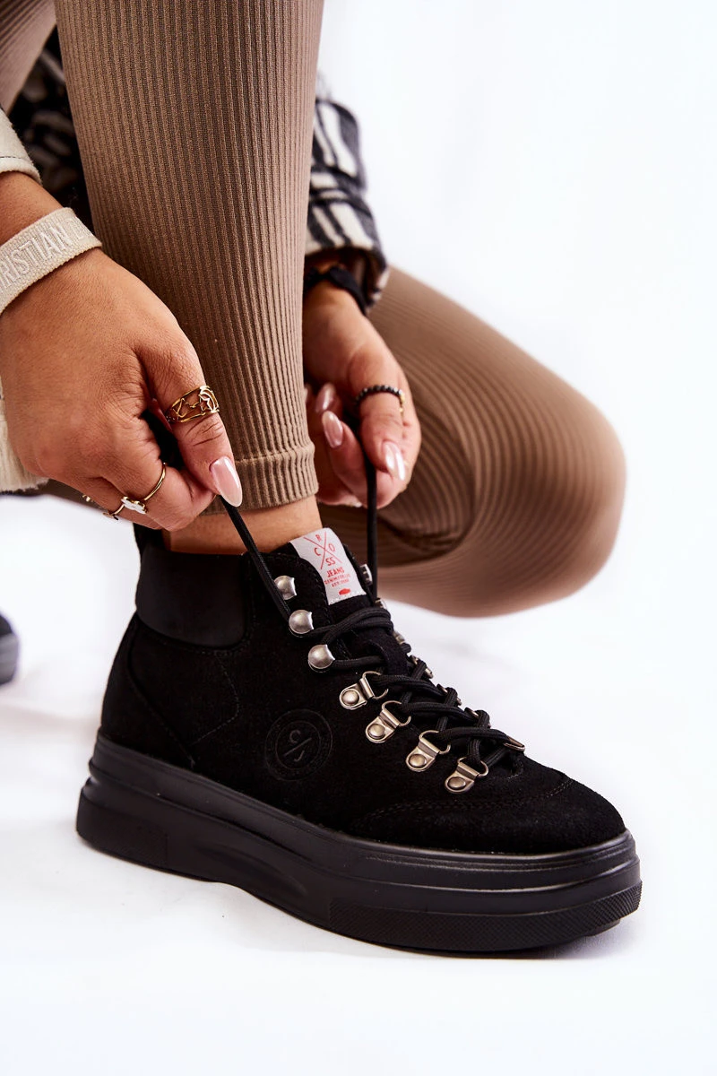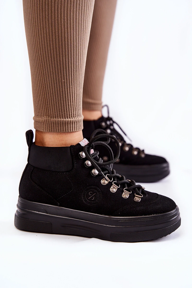 Holínky ve stylu Trapper jsou ideální pro chladnější dny! Byly vyrobeny z kombinace imitace semiše a syntetického materiálu. Mají klasické šněrování s kulatými tkaničkami. Model s dodatečně vyztuženou patou. Turistické boty jsou namontovány na silné masivní platformě. Ideální pro podzimní stylizace. Musíte je mít! Při výběru velikosti použijte tabulku velikostí.