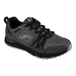Pánská obuv Skechers Escape Plan je dokonalou kombinací sportovního stylu a lehce odpruženého pohodlí při nošení. Nízký svršek v kotníkové délce je vyroben z kombinace lícové kůže a syntetiky, což vypovídá o vynikající kvalitě boty. Díky použité technologii Water Repellent je tato obuv voděodolná a skvěle se hodí do deštivého podzimního počasí. Stélka je vybavena systémem Air Cooled, který zajišťuje senzační cirkulaci vzduchu. Technologie Memory Foam použitá ve stélce má navíc na svědomí dokonalé přizpůsobení se noze. Podrážka s drenážním systémem All Terrain odvádí přebytečnou vlhkost z vnitřku boty a dezén zajišťuje skvělou přilnavost v jakémkoli terénu.