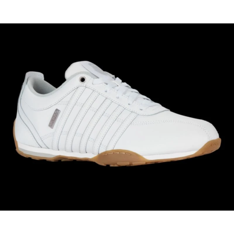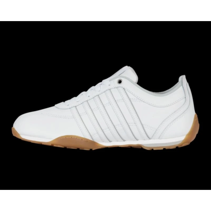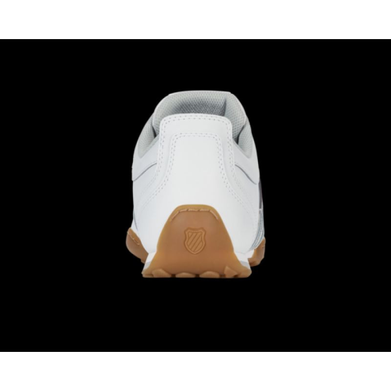 - Klasický design: Tenisky jsou laděny do minimalistické bílé barvy s jemným kontrastem v podobě světle hnědé gumové podrážky, zatímco decentní logo značky K-Swiss jim dodává charakter.