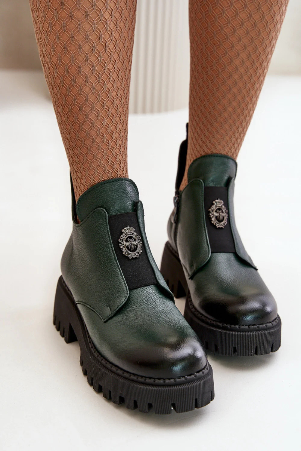 Dámské botky byly vyrobeny z vysokokvalitní přírodní kůže. Umístěny na masivním podpatku a platformě s drážkami. Model se zapíná na zip po vnitřní straně štěrbiny. Na přední elastické vložce je ozdoba z umělé hmoty. Vnitřek je vyplněn kožešinovým obložením. Tento výjimečný model obohatí mnoho vašich stylizací!