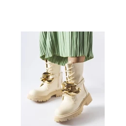 Béžové trapery s řetízkem Galar jsou naprostým hitem této sezóny! Tento model kombinuje všechny nejmodernější trendy. Svršek je vyroben z kvalitní ekologické kůže, což zaručuje pohodlné nošení. Zlaté detaily dodávají botám eleganci a styl. Velikostní škála je standardní, takže se vyplatí držet svou běžnou velikost. Trapery nemají žádné zateplení a podrážka je vyrobena z odolné gumy v béžové barvě. Ideální boty na podzim a zimu!