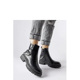 Černé kotníčkové boty s řetízkem Muqaddim jsou skvělou volbou na zimu pro mladou generaci. Boty zdobené řetízkem mají plochý podpatek a kulatou špičku, co je dělá nejen stylové, ale také pohodlné na nošení po celý den. Vyrobené z vysoce kvalitní ekologické kůže, poskytují dodatečnou ochranu před vlhkostí a sněhem, ideální na deštivé nebo sněhové dny. Kotníčkové boty mají praktický zip, který usnadňuje jejich obouvání a svlékání. Díky vnitřnímu polstrování jsou boty teplé a pohodlné i v nejchladnější dny. Jejich módní výška nad kotníkem jim dodává moderní vzhled, který se hodí k různým stylizacím. Dostupné za přijatelnou cenu, tyto kotníčkové boty jsou skvělou volbou pro ty, kteří hledají levné a trendy boty na zimu. Ideální pro kolekci Podzim/Zima.