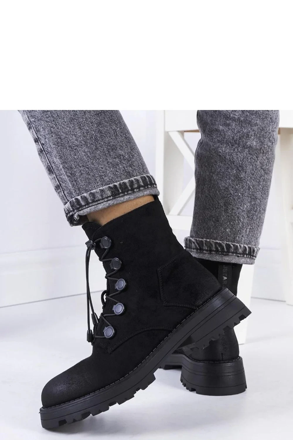 Černé kotníčkové boty z ekokože Chesterfield jsou ideální obuví na chladnější dny. Mají tlustou podrážku s ochranným prvkem, co zajišťuje pohodlí a ochranu před vlhkem. Botky se vážou vpředu na kulaté tkaničky a mají kulatý špičatý konec. Jsou vyrobeny z ekokože semiše a jsou lehce vyztužené uvnitř, co je činí ideálními na podzimní a zimní procházky. Skvěle vypadají ve spojení s legíny z ekokože a svetrem s lehce oversized střihem. Velikost je standardní, takže je dobré se řídit svou velikostí při nákupu. Botky mají zip a podrážka je vyrobena z černého umělého materiálu. Jedná se o obuv z kolekce Podzim/Zima, která skvěle doplní váš podzimně-zimní šatník.