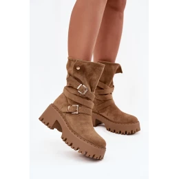 Boty pro ženy vyrobené z ekokože. Umístěné na masivním podpatku, který zajistí stabilitu každým krokem. Zaoblené špičky. Tento model se vyznačuje páskem opleteným kolem svršku se zlatými sponami. Horní část svršku se zapíná na dva suché zipy. Bez ohledu na příležitost, tyto boty budou skvělým doplňkem vašeho šatníku!