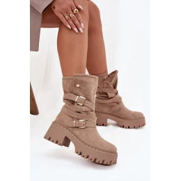 Botky pro dámy vyrobené z ekologického semiše. Umístěné na masivním podpatku, který zajistí stabilitu každým krokem. Zaoblené špičky. Tento model se vyznačuje páskem obtočeným kolem svršku s zlatými přezkami. Horní část svršku se zapíná na dva patentky. Bez ohledu na příležitost budou tyto botky skvělým doplňkem vaší šatníku!