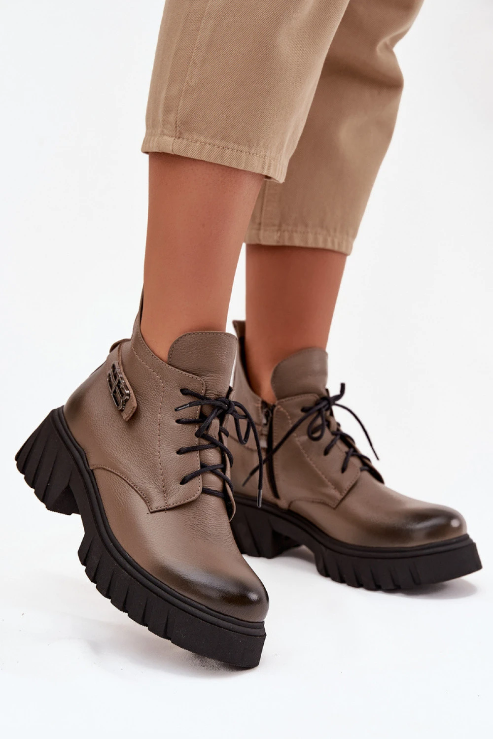 Dámské kotníkové boty vyrobené z přírodní kůže. Zapínají se na zip a navíc mají šněrování. Špičky jsou zaoblené. Vnitřek je vyplněn měkkým filcem, který poskytuje teplo i v nejchladnějších dnech. Filc nejen chrání před chladem, ale také zvyšuje pohodlí nošení díky své měkkosti a izolačním vlastnostem. To zaručuje, že kotníkové boty jsou ideální volbou na podzimní a zimní měsíce, zajistí nejen stylový vzhled, ale také pohodlí a ochranu před chladem. Tyto boty jsou skvělou kombinací klasického stylu a moderních prvků, které se osvědčí v různých stylizacích, od casual až po elegantní.